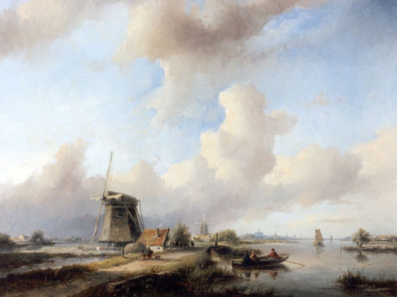 Jan Jacob Spohler kunstwerk • schilderij • voorheen te koop Zomers rivierenlandschap met figuren bij een molen