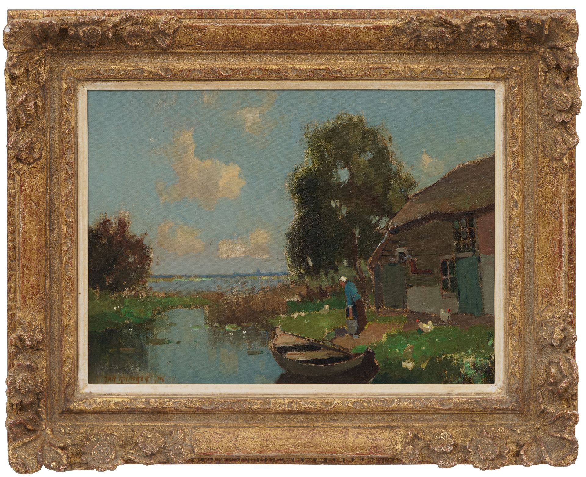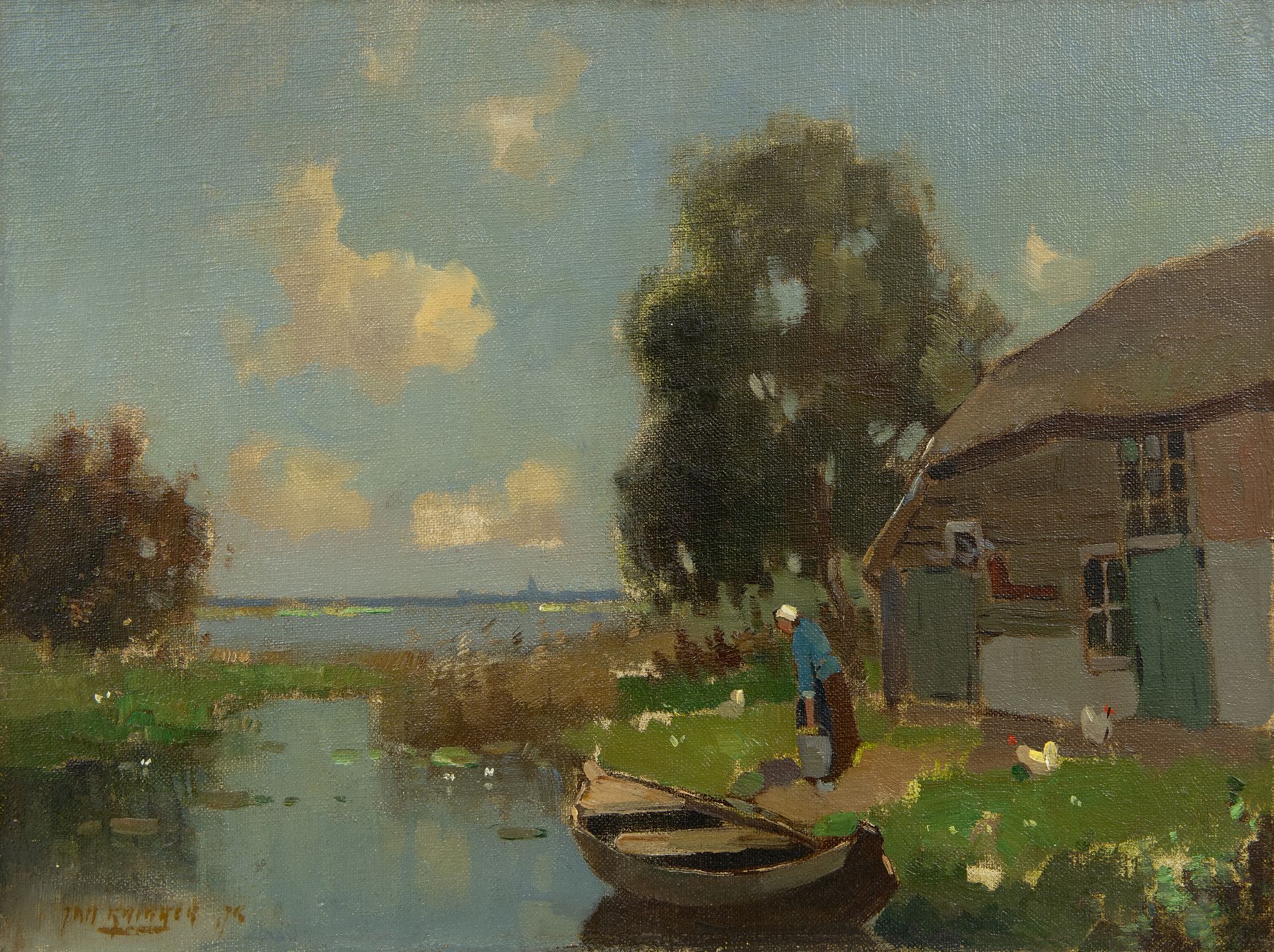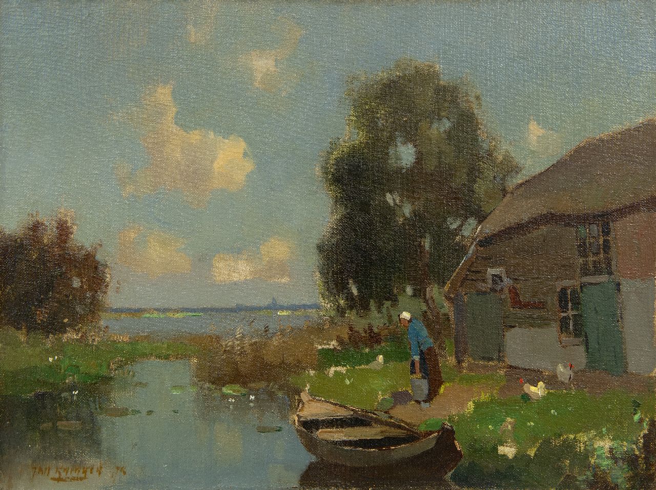 Jan Knikker jr. kunstwerk • schilderij • te koop Boerenerf aan een veenplas