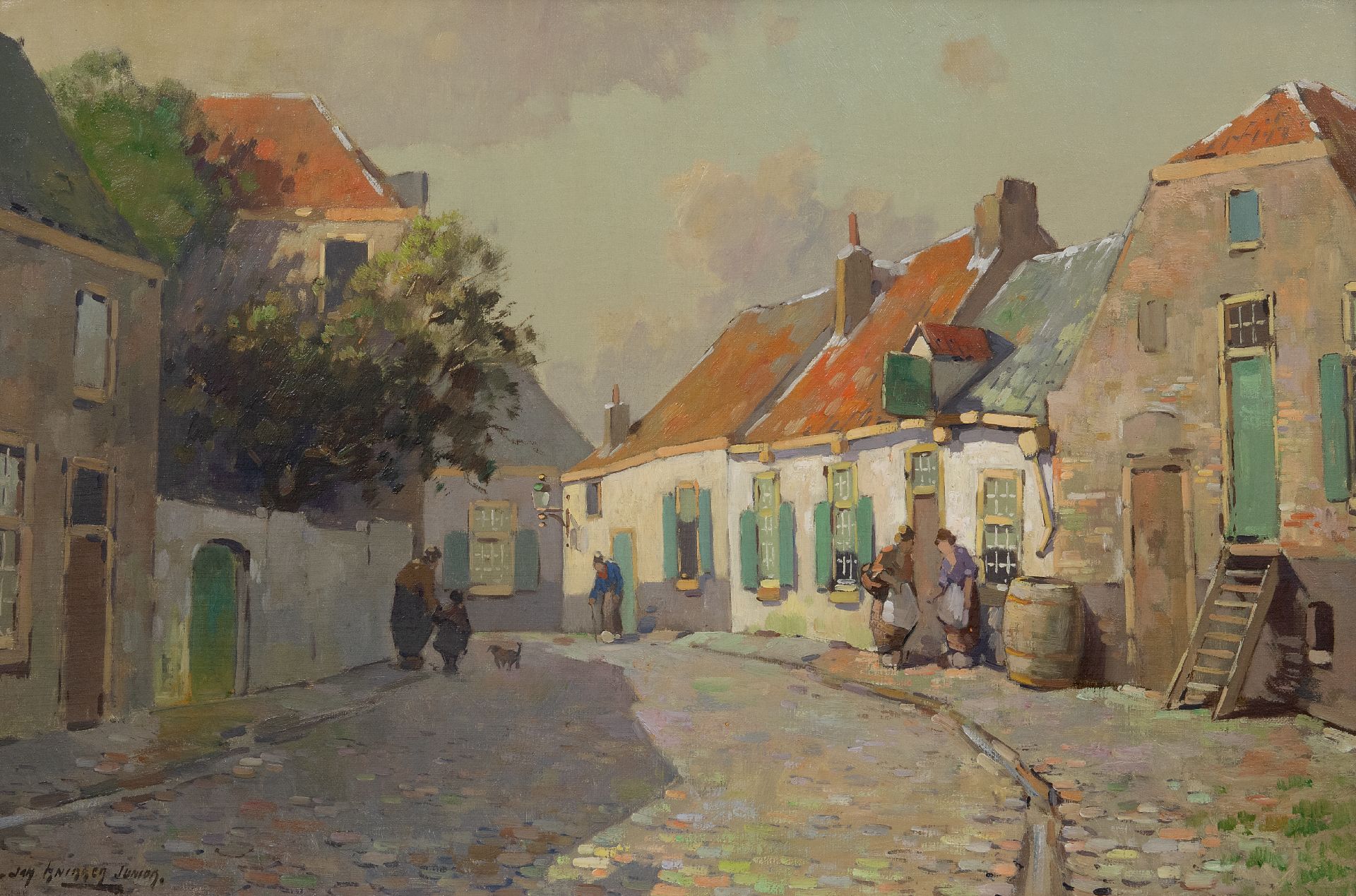 Jan Knikker jr. kunstwerk • schilderij • te koop Zonnig dorpsgezicht met figuren
