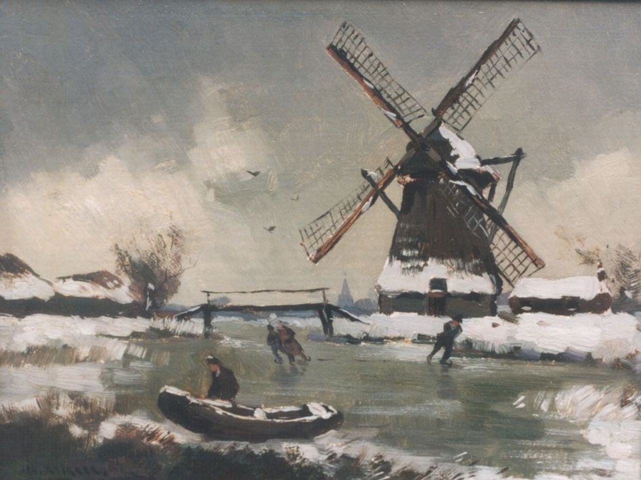Jan Knikker sr. kunstwerk • schilderij • voorheen te koop Schaatsers op een bevroren vaart