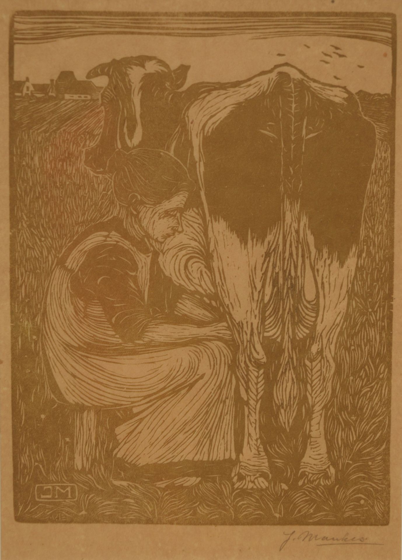 Mankes J.  | Jan Mankes | Grafiek te koop aangeboden | Koemelkster, houtsnede op papier 19,1 x 14,2 cm, gesigneerd rechtsonder voluit (in potlood) en met mon. in het blok