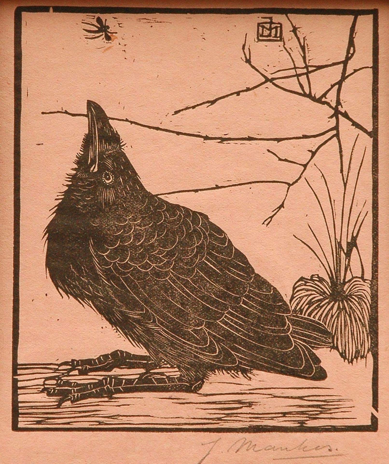 Jan Mankes kunstwerk • grafiek • voorheen te koop Kraai, omhoog kijkend naar mugje