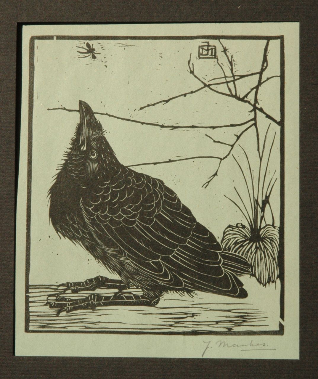 Jan Mankes kunstwerk • grafiek • voorheen te koop Kraai, omhoog kijkend naar mugje