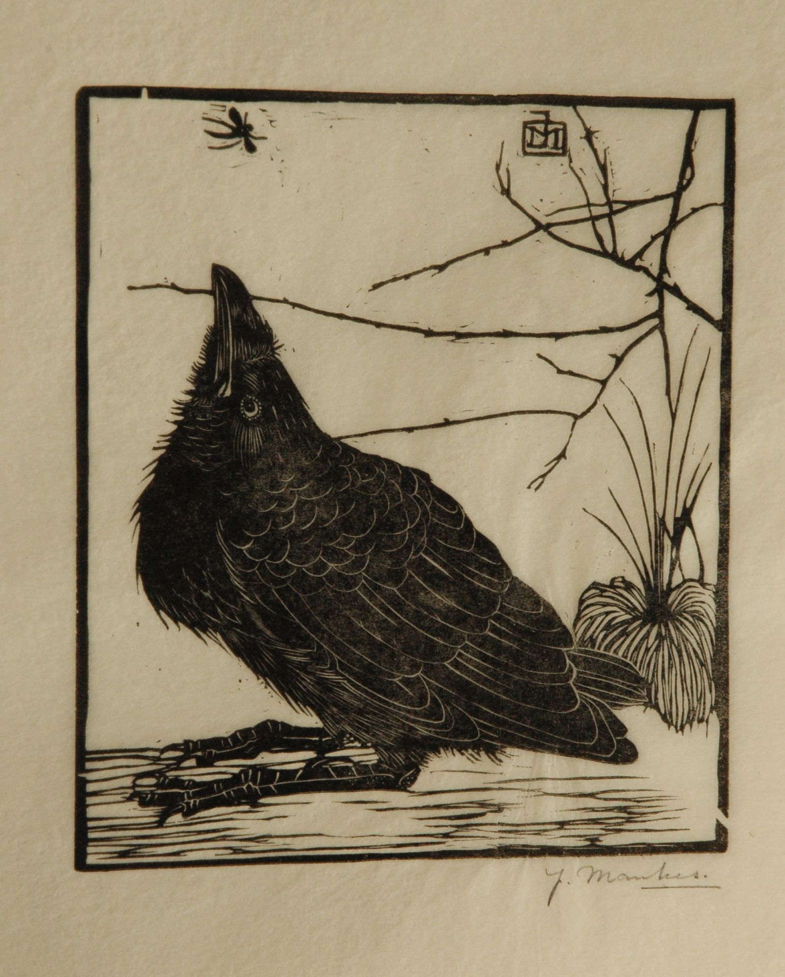 Jan Mankes kunstwerk • grafiek • voorheen te koop Kraai, omhoog kijkend naar mugje
