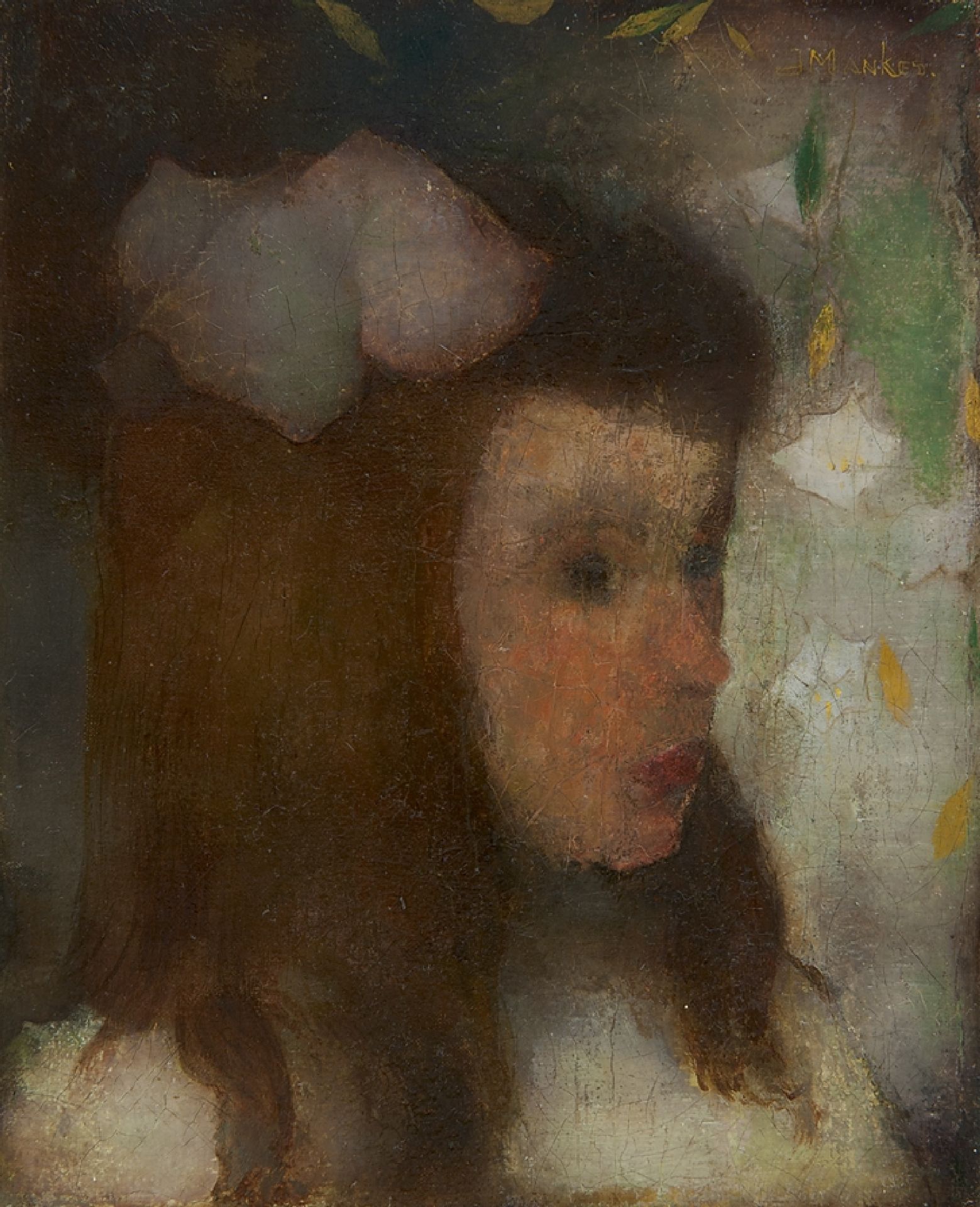 Jan Mankes kunstwerk • schilderij • voorheen te koop Meisjeskopje met bloem en strik in het haar (Akke Venema)
