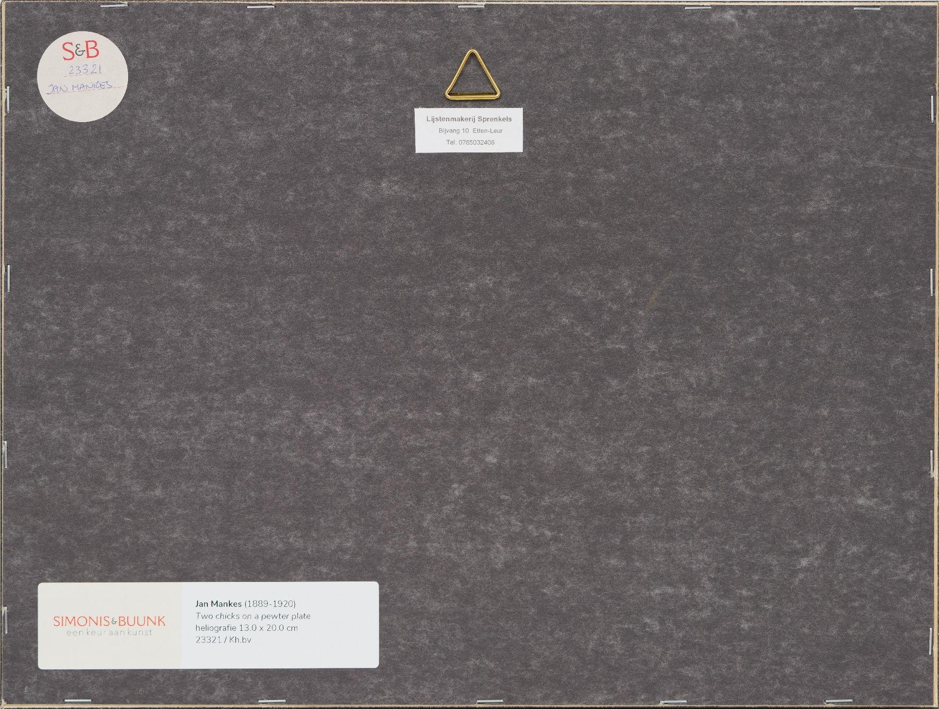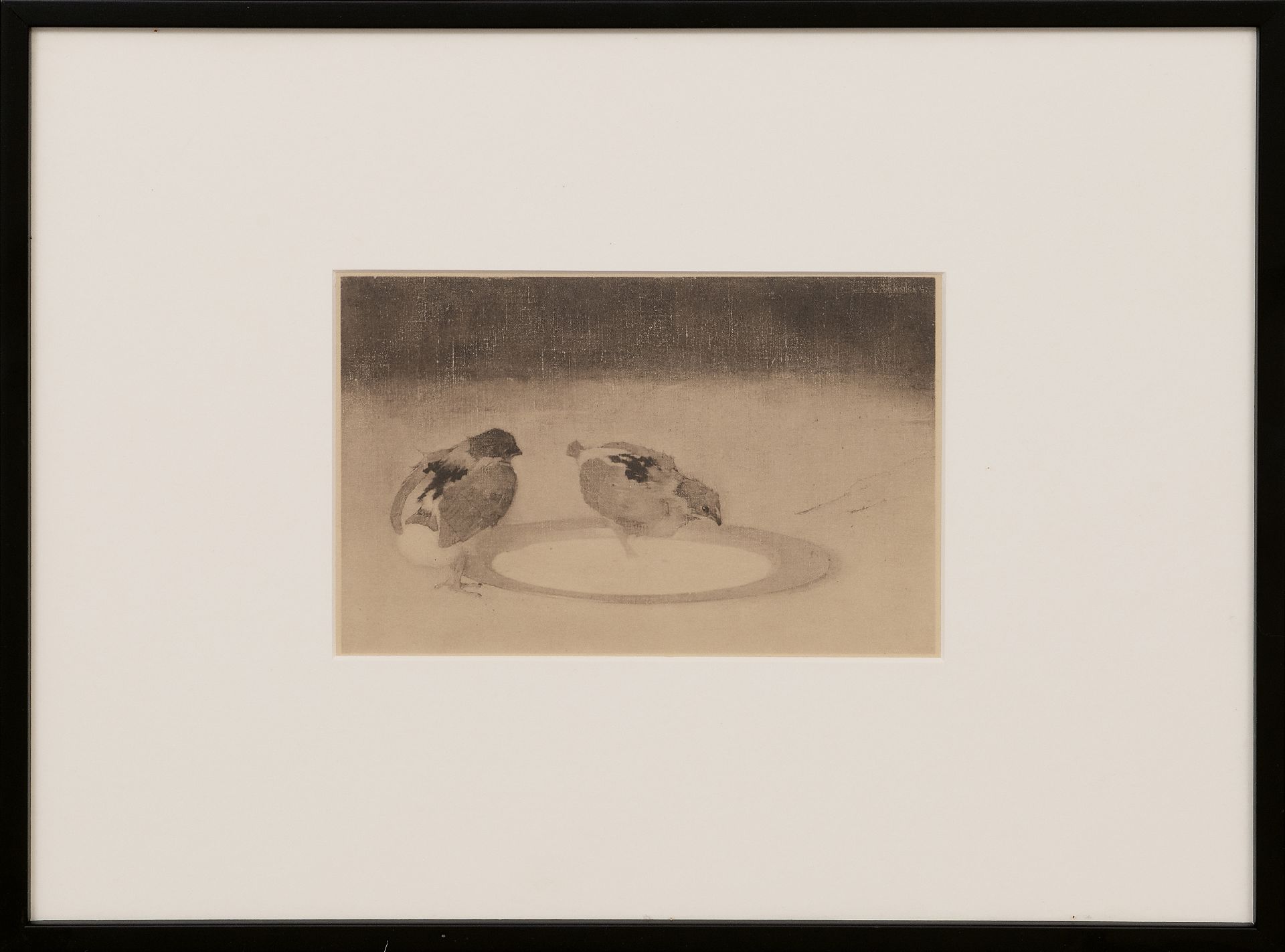 Jan Mankes kunstwerk • grafiek • voorheen te koop Twee kuikens op een tinnen bord