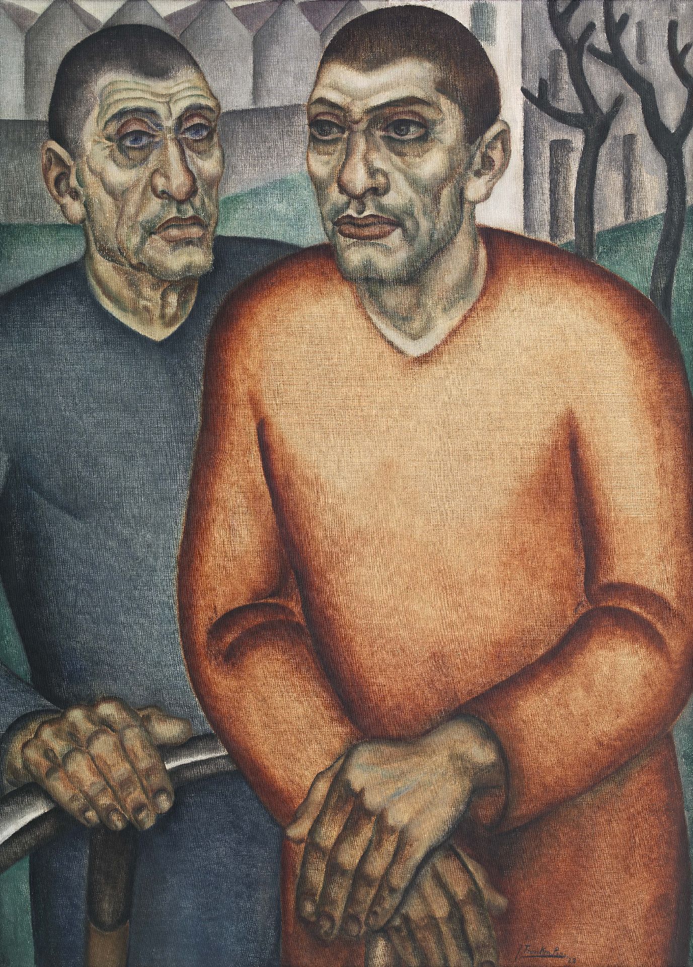 De schilder-graficus Jan Franken maakte niet alleen naam met zijn houtsneden, maar was tussen 1922 en 1928 ook een gevierd expressionist. Veel waardering oogstte hij met zijn arbeiders en boeren, die hij vorm gaf in krachtige lijnen en contrasterende kleurvlakken om hun vaak kommervolle bestaan de onderstrepen. De compositie, met dominerende figuren op de voorgrond tegen een decor van op de figuren betrokken elementen, ontleende hij aan Vlaamse expressionisten als Gustave de Smet. Franken kreeg ook veel opdrachten voor het maken van boekillustraties, boekbanden en ex libris.