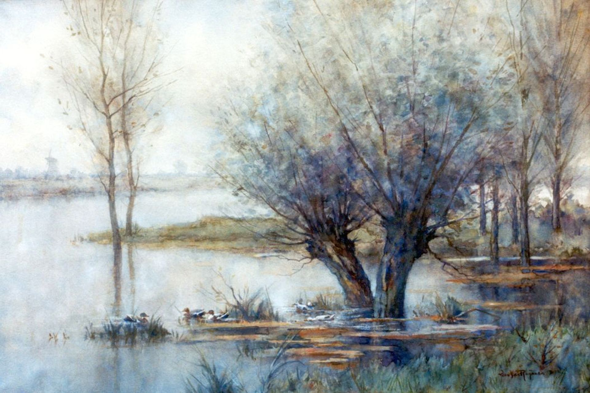 Jan Rhijnnen kunstwerk • aquarel • tekening • voorheen te koop Eenden in een plassenlandschap