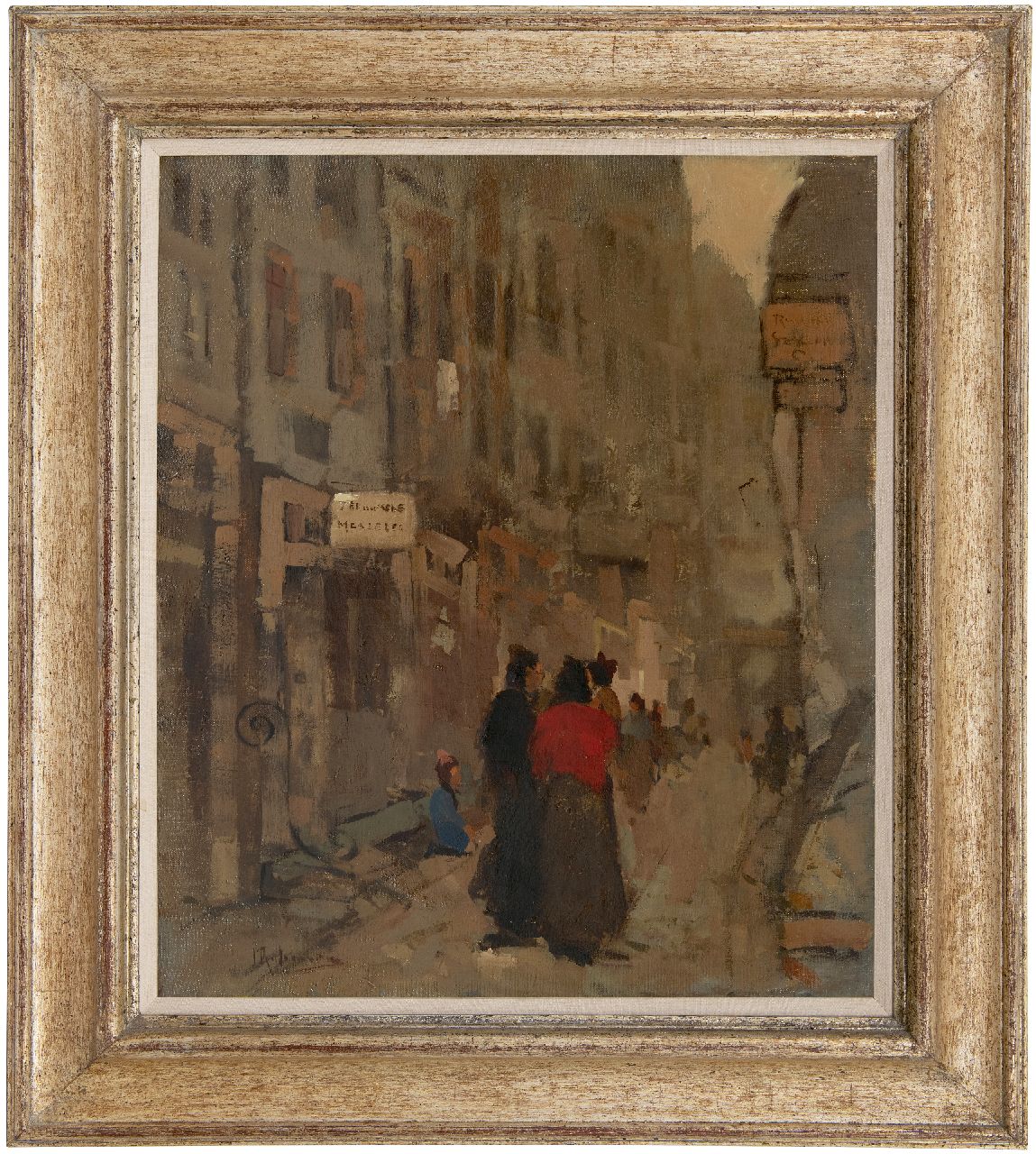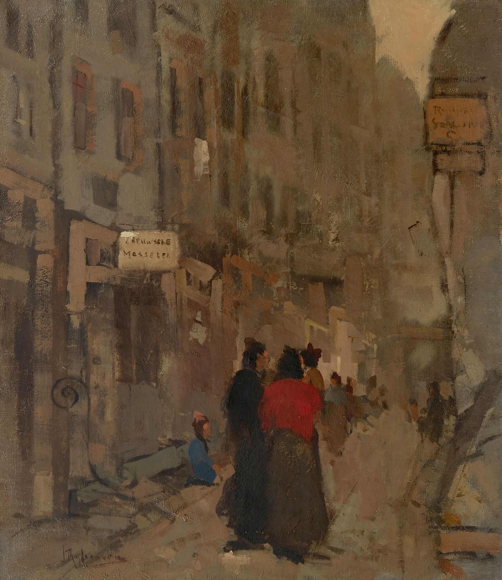 Jan Rijlaarsdam kunstwerk • schilderij • voorheen te koop Levendig straatje met uithangbord 'Zeeuwse mosselen'