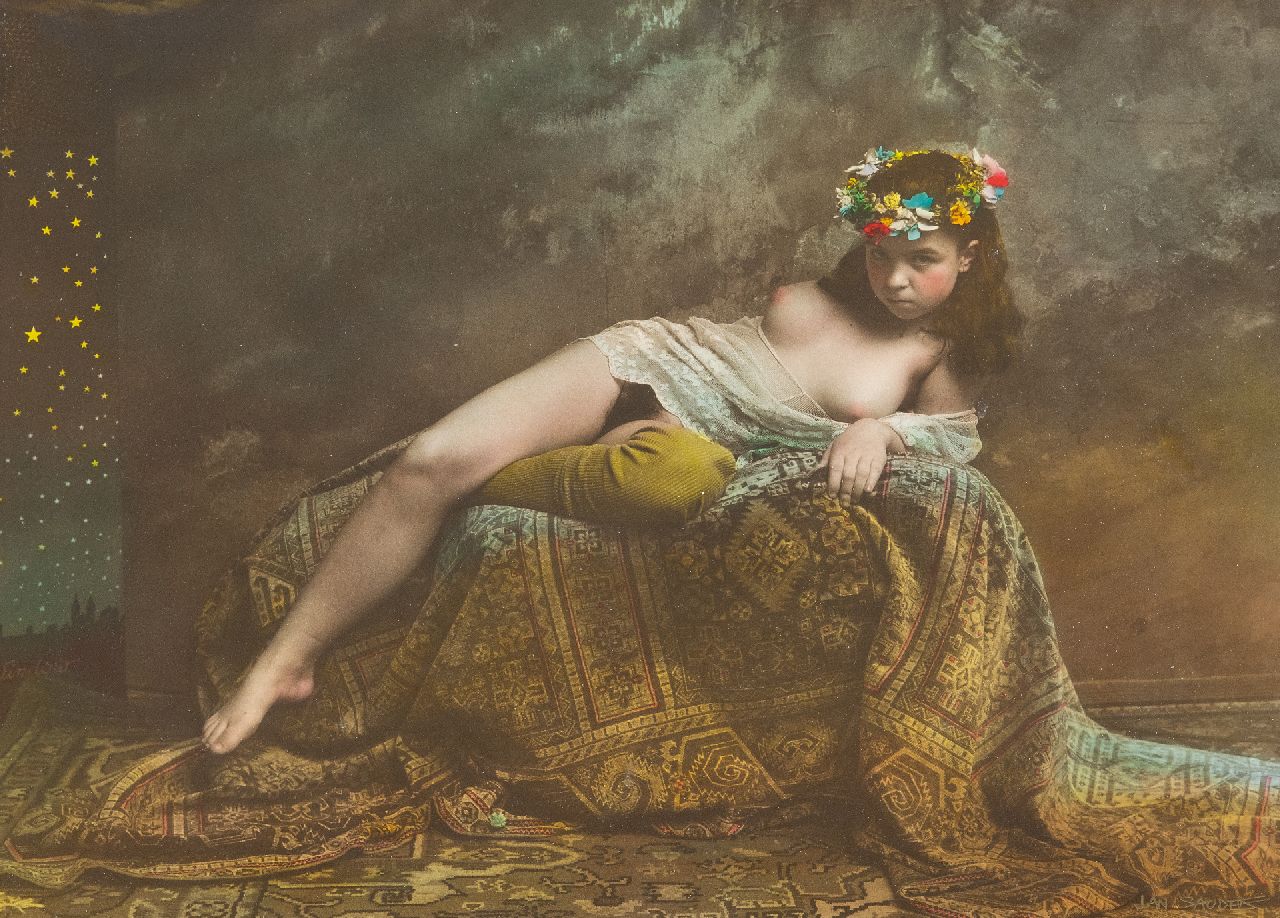 Jan Saudek kunstwerk • grafiek • voorheen te koop Liggend naakt met bloemenkrans