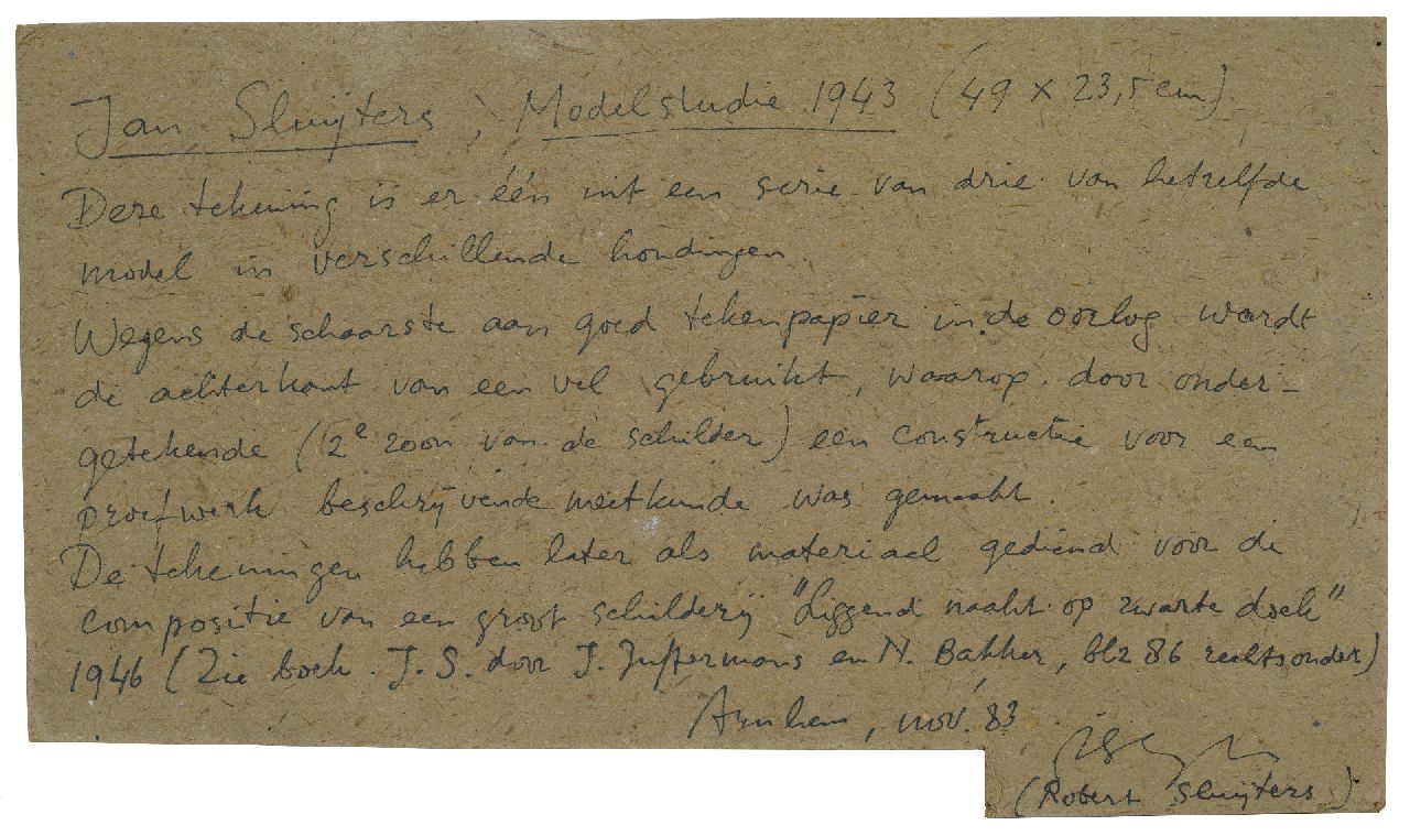 annotatie Annotatie op voormalig achtertikkarton: 'Jan Sluijters, Modelstudie 1943. Deze tekening is er één uit een serie van drie van hetzelfde model in verschillende houdingen. Wegens de schaarste aan goed tekenpapier in de oorlog wordt de achterkant van een vel gebruikt, waarop door ondergetekende (2e zoon van de schilder) een constructie voor een proefwerk beschrijvende meetkunde was gemaakt. De tekeningen hebben later als materiaal gediend voor de composiie van een groot schilderij ''Liggend naakt op zwarte doek'' 1946 (zie boek J.S. door J.Juffermans en N. Bakker, blz. 86 rechtsonder. Arnhem, nov. '83 Robert Sluijters.