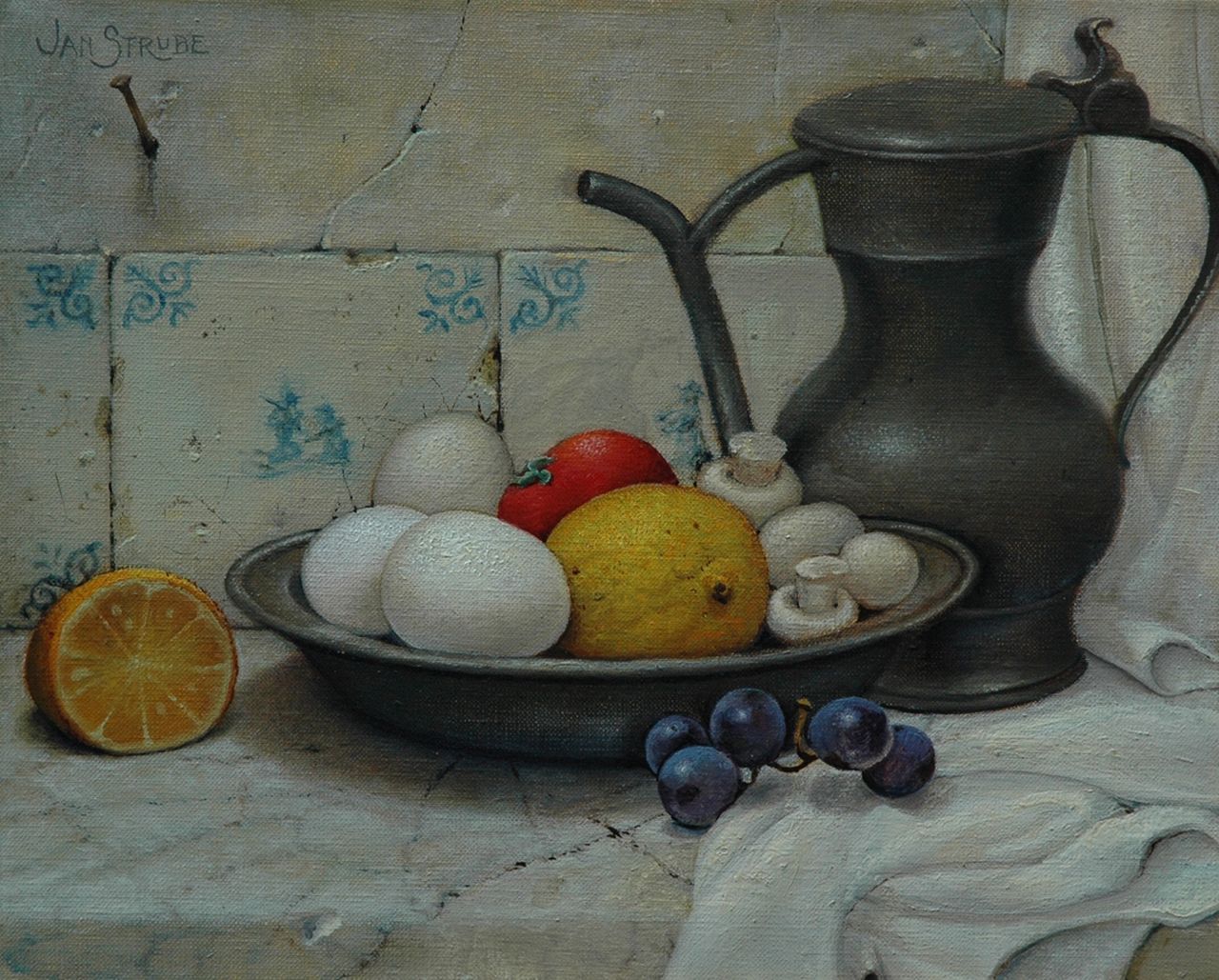 Jan Strube kunstwerk • schilderij • voorheen te koop Stilleven met fruitschaal en tinnen kan