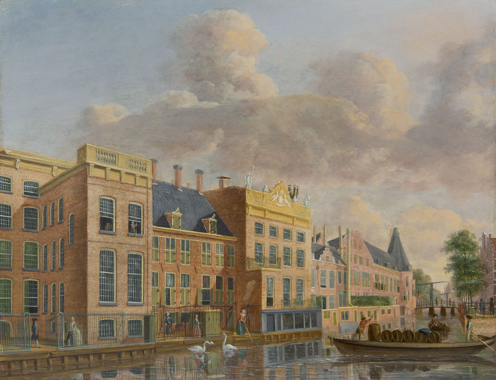 De Amsterdammer Jan ten Compe maakte veel topografische tekeningen, maar met zijn geschilderde stadsgezichten kreeg hij veruit de grootste bekendheid. In zijn schilderijen combineert hij de fijne detaillering van de gebouwen met prachtig uitgewerkte luchtpartijen daarboven. De Kloveniersdoelen, op dit schilderij te zien links, vóór de toren 'Swych Utrecht', diende als verzamelplaats en oefenruimte voor een aantal compagnieën van de plaatselijke schutterij. De Nachtwacht, het door Rembrandt in 1642 afgeleverde groepsportret van een van de klovenierscompagnieën, hing tot rond 1715 in de grote feestzaal van de Kloveniersdoelen. Rembrandt was in 1635 verhuisd met zijn vrouw Saskia van Uylenburgh naar een huurhuis aan de Nieuwe Doelenstraat, waar ze tot 1637 bleven wonen. De straat was toen een deftige plek om te wonen, met mooie, nieuwe huizen.