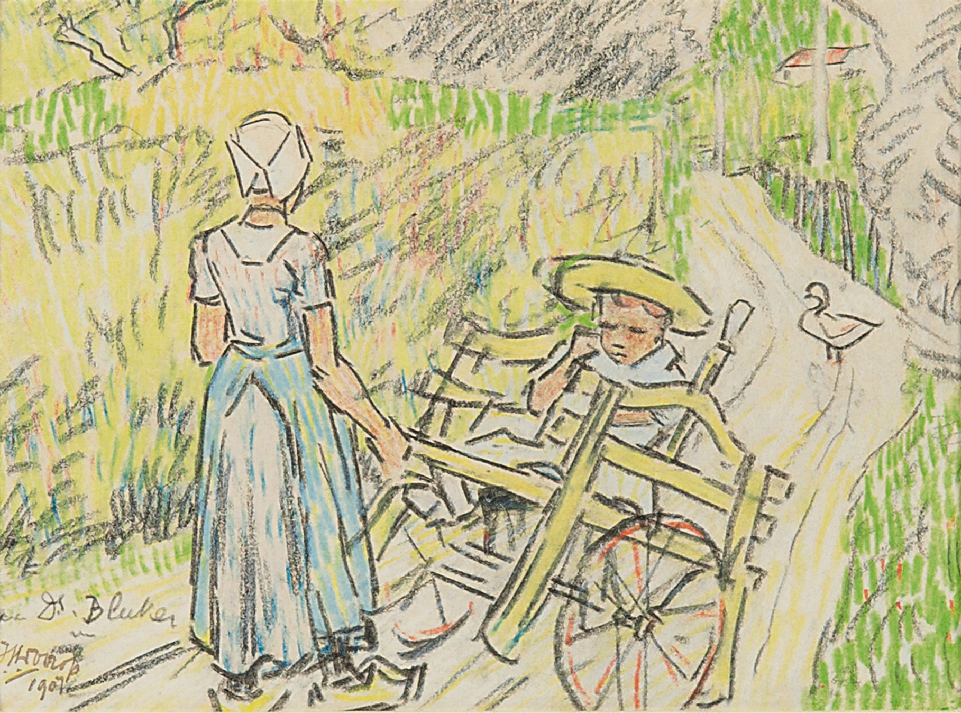 Jan Toorop kunstwerk • aquarel • tekening • voorheen te koop Kindermeisje met Fransje Elout en tamme gans 'de Poele' in Domburg
