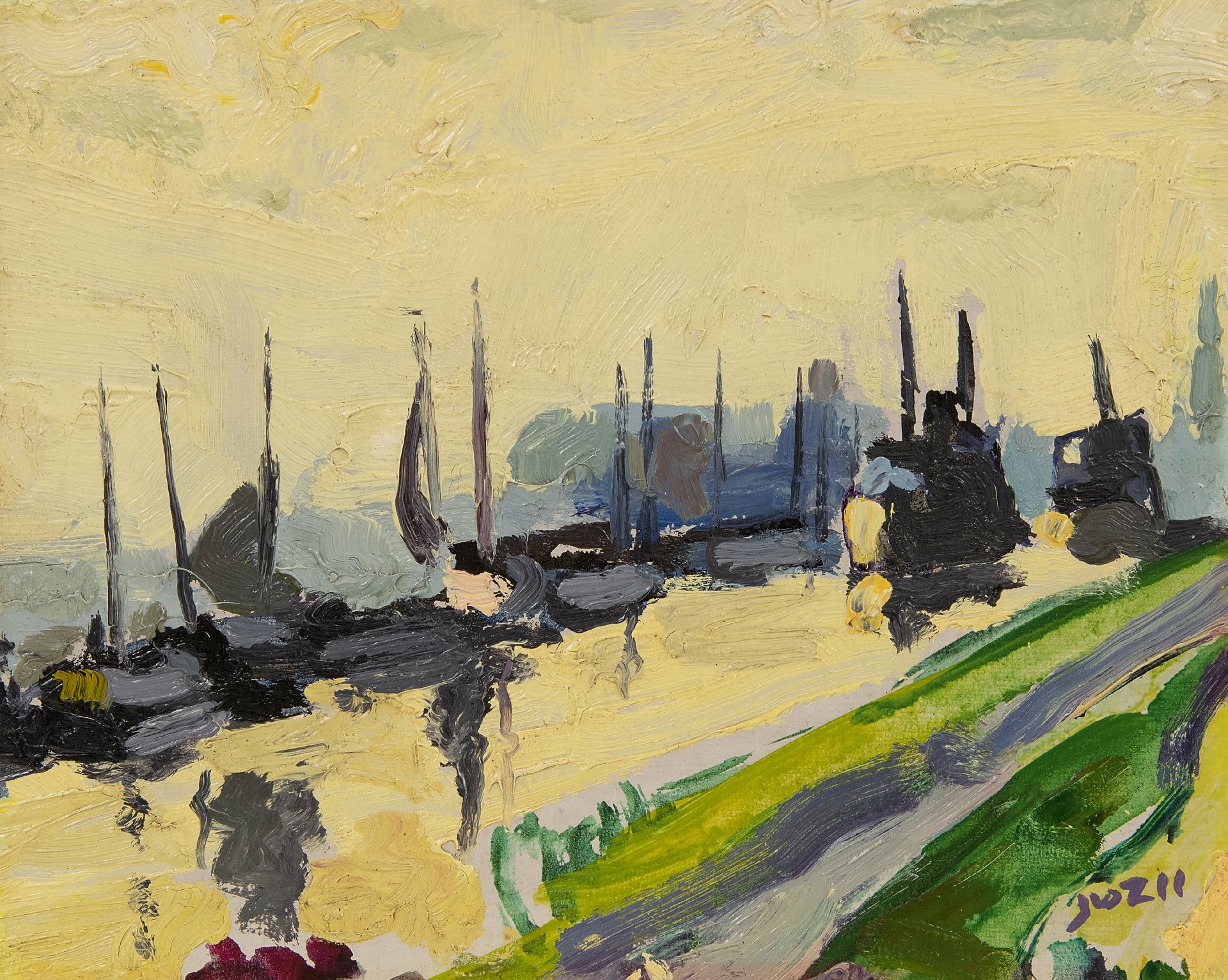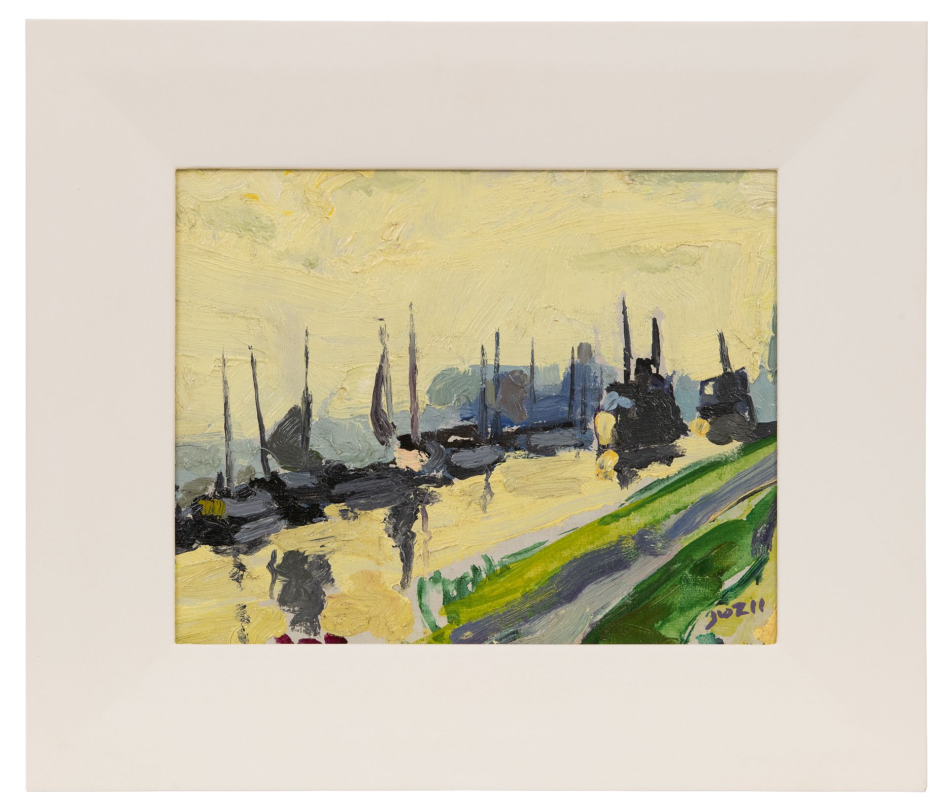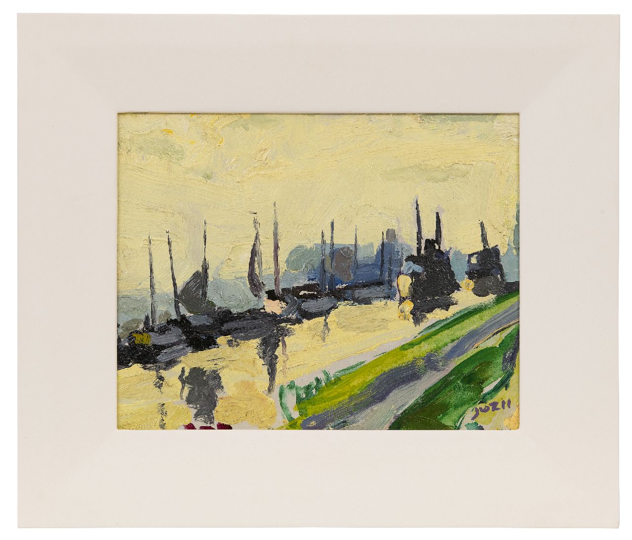 Jan van der Zee kunstwerk • schilderij • voorheen te koop Schepen in het Damsterdiep; verso: Zomerlandschap