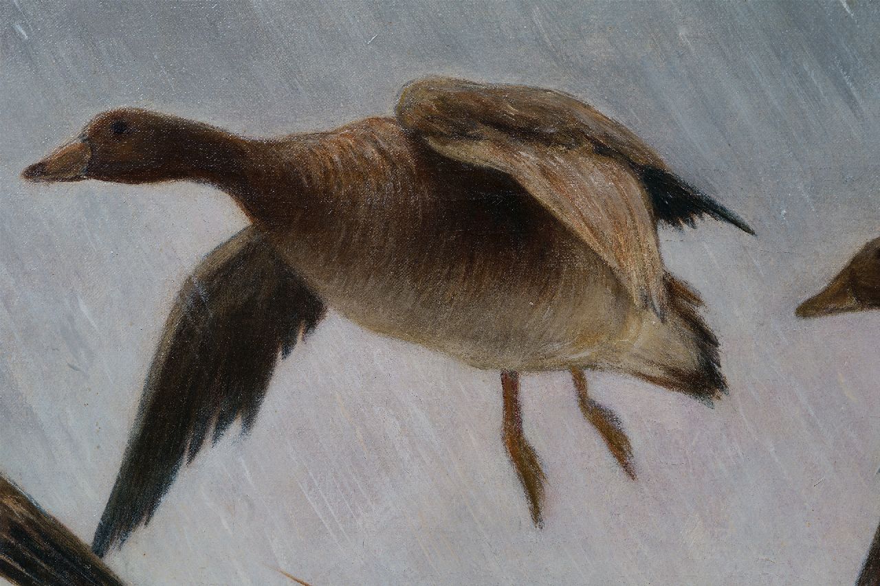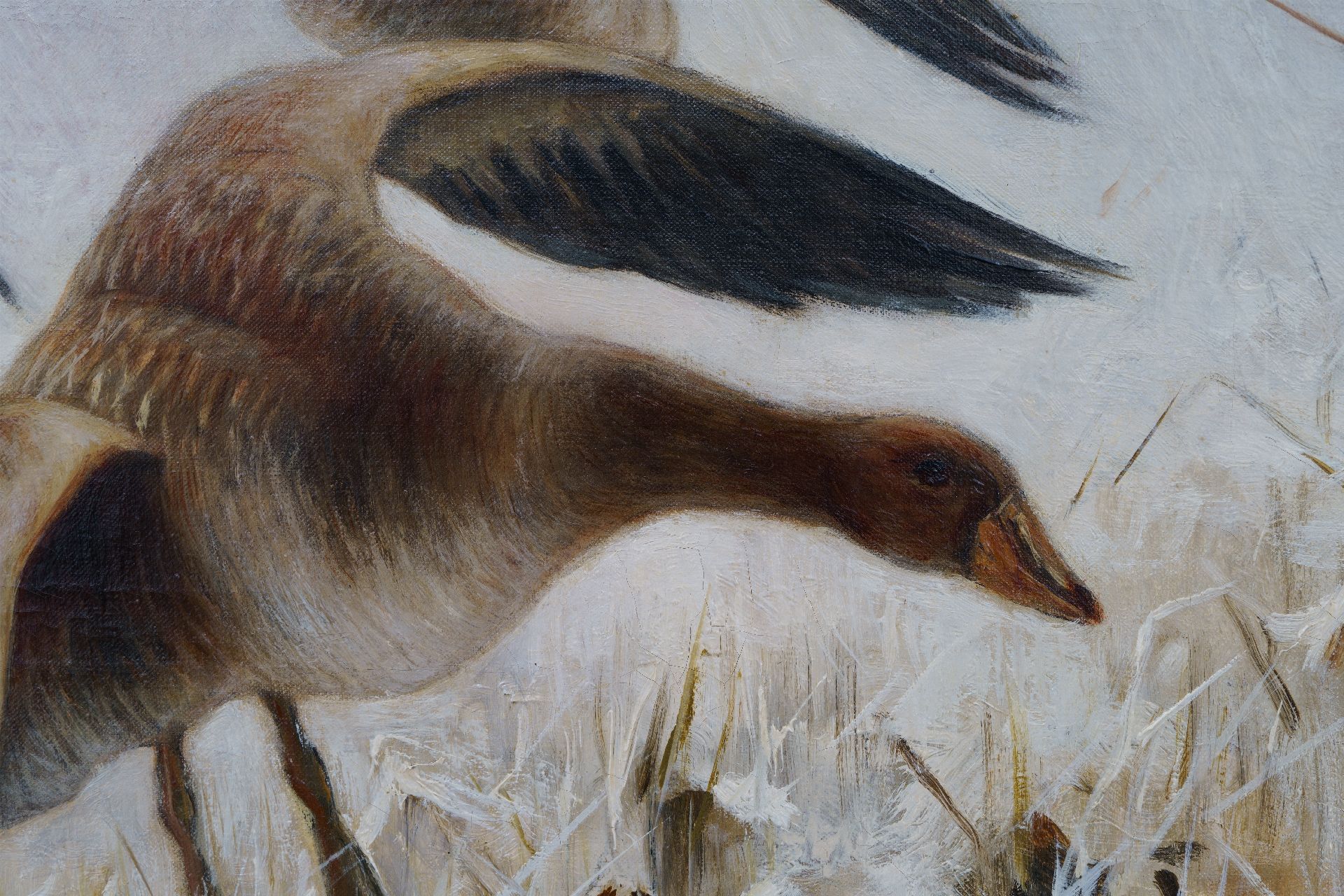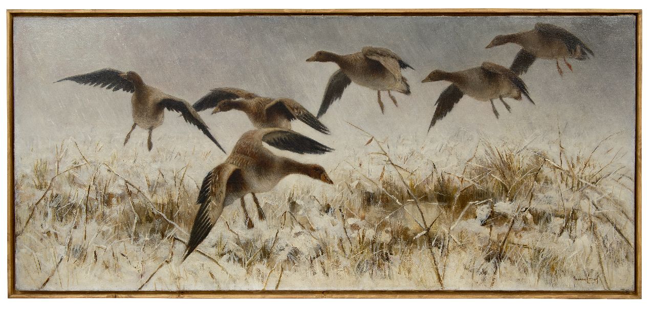 Jan van Essen kunstwerk • schilderij • voorheen te koop Ganzen in sneeuwlandschap