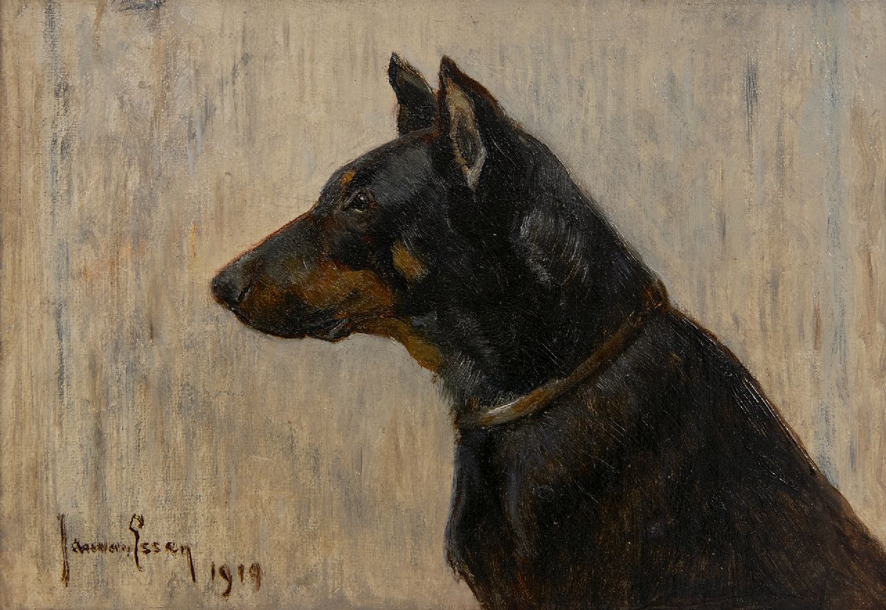 Jan van Essen is een bekende Nederlandse dierschilder uit de tweede helft van de negentiende eeuw. Aanvankelijk schilderde hij landschappen en stadsgezichten maar onder invloed van de Engelse dierenschilder J. Swan ging hij zich vanaf 1885 ook toeleggen op dieren. In de Amsterdamse dierentuin Artis maakte hij vele studies van vogels en leeuwen. Aan waardering heeft het hem nooit ontbroken, want op tentoonstellingen in Amsterdam, Duitsland, Frankrijk en Australië werd zijn werk bekroond. Van Essen leerde het schildersvak van Johan Conrad Greive (1837-1891), schilder van rivier- en stadsgezichten. Ook werkte hij korte tijd op het atelier van de genreschilder Hendrik Valkenburg (1826-1896). Na 1890 schilderde hij ook jachttaferelen.