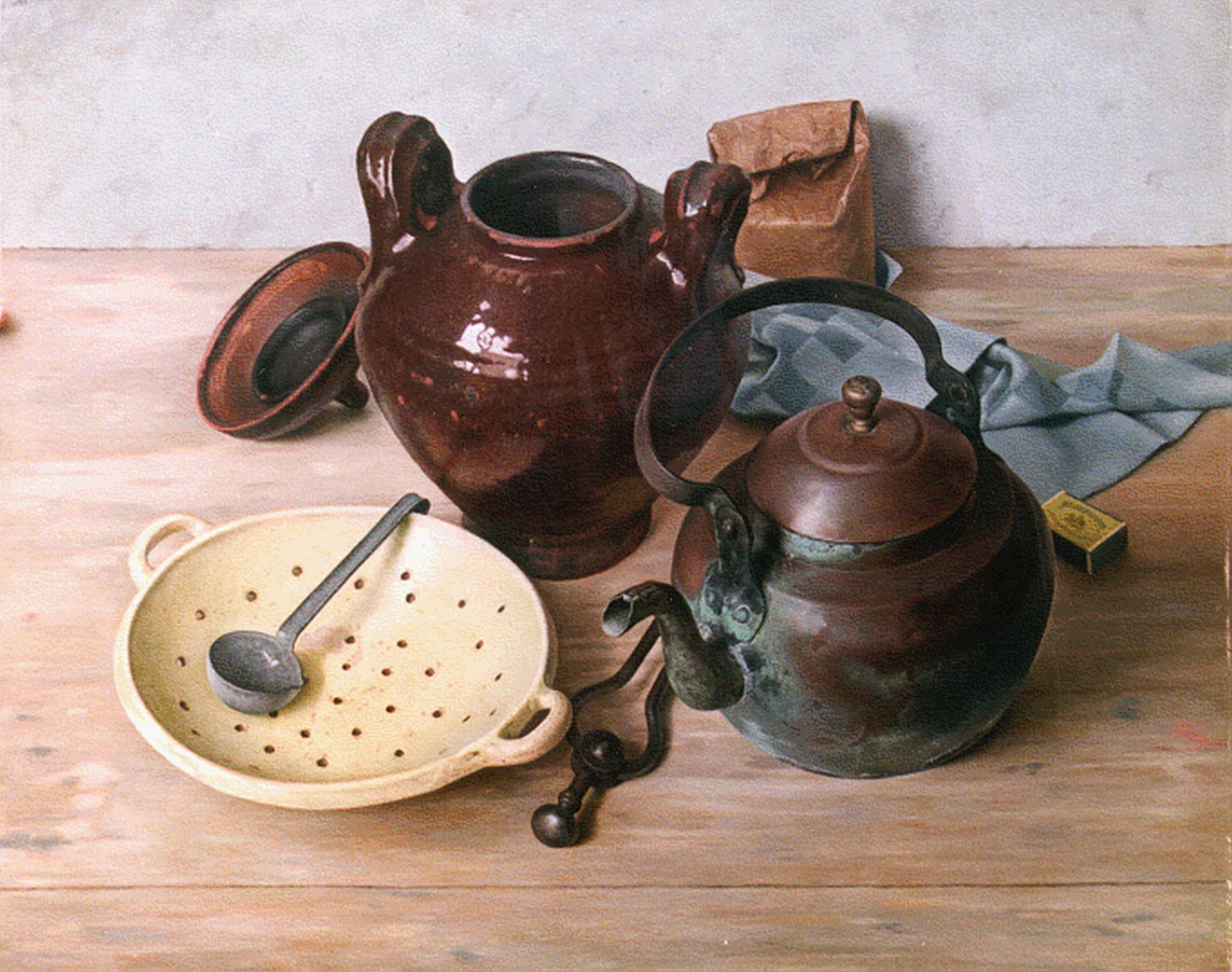 Jan van Tongeren kunstwerk • schilderij • voorheen te koop Stilleven van potten op houten tafel