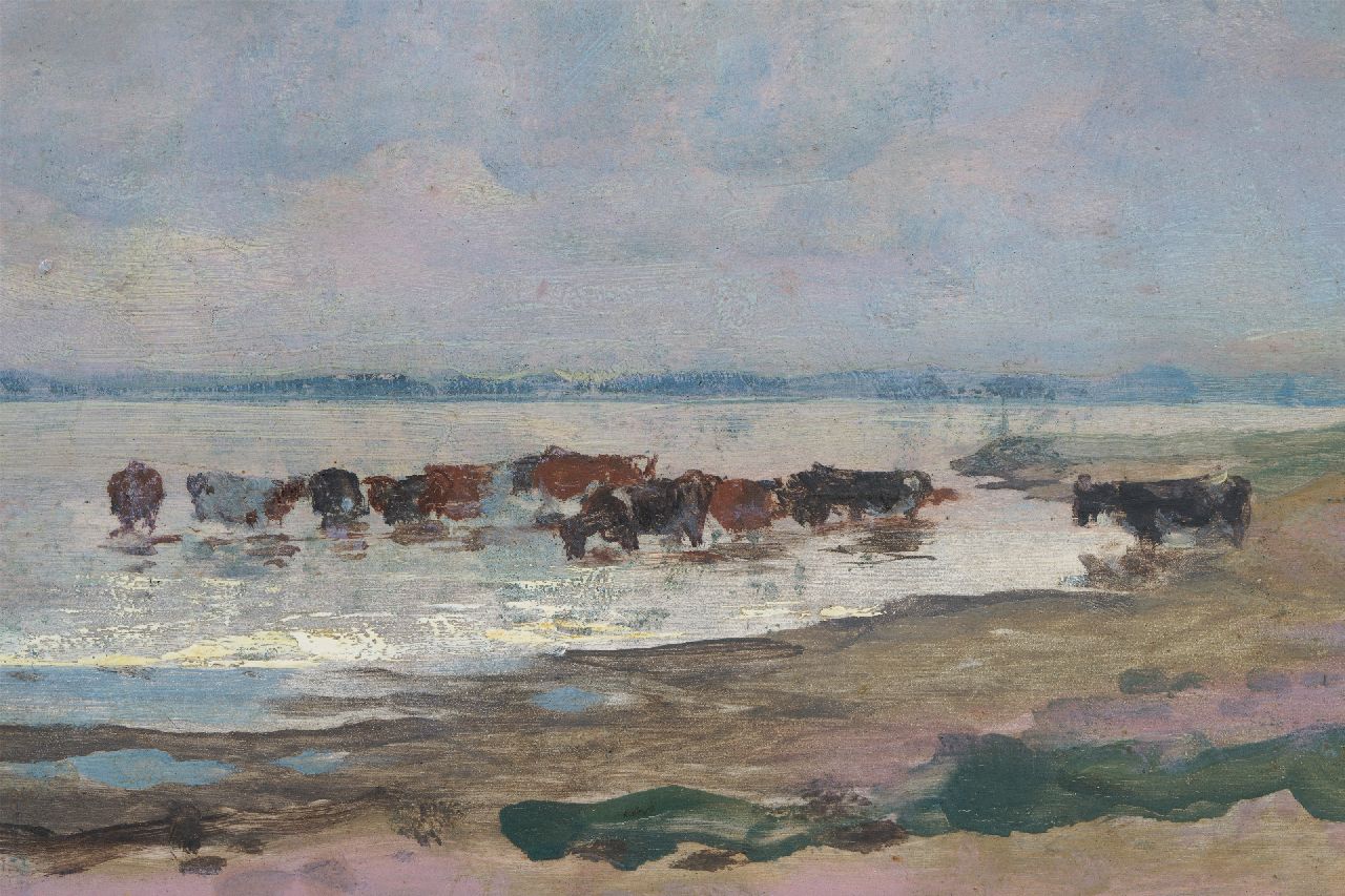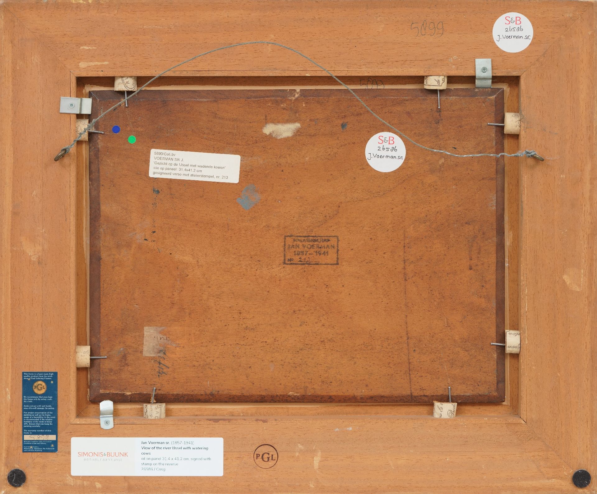 Jan Voerman was een boerenzoon, al jong bevriend met de schilder Willem Tholen. Samen kregen ze hun eerste schilderlessen en bezochten ze de Rijksacademie in Amsterdam. Daarna schilderde Voerman landschappen, genrestukken, bloemstillevens en stadsgezichten. Zijn werk veranderde toen hij in 1896 kwam te wonen aan de Geldersedijk in Hattem, van waaruit hij een prachtig uitzicht had op de uiterwaarden van de IJssel, waar honderden koeien graasden. Vanaf die tijd schilderde hij vooral IJsselgezichten, in verfijnde, bleke kleuren onder hoge wolkenluchten. Voerman aquarelleerde veel en trachtte het transparante van deze techniek over te brengen naar olieverf. Eenbocht in de Ijssel met wadende koeien, zoals hier afgebeeld, behoorde tot zijn favoriete onderwerpen. dit schilderij bevond zich vermoedelijk in zijn atelier toen hij in 1941 overleed. Zoals wel vaker gebeurde werden de werken die toen (nog) niet gesigneerd waren voorzien van een nalatenschapstempel met nummer.