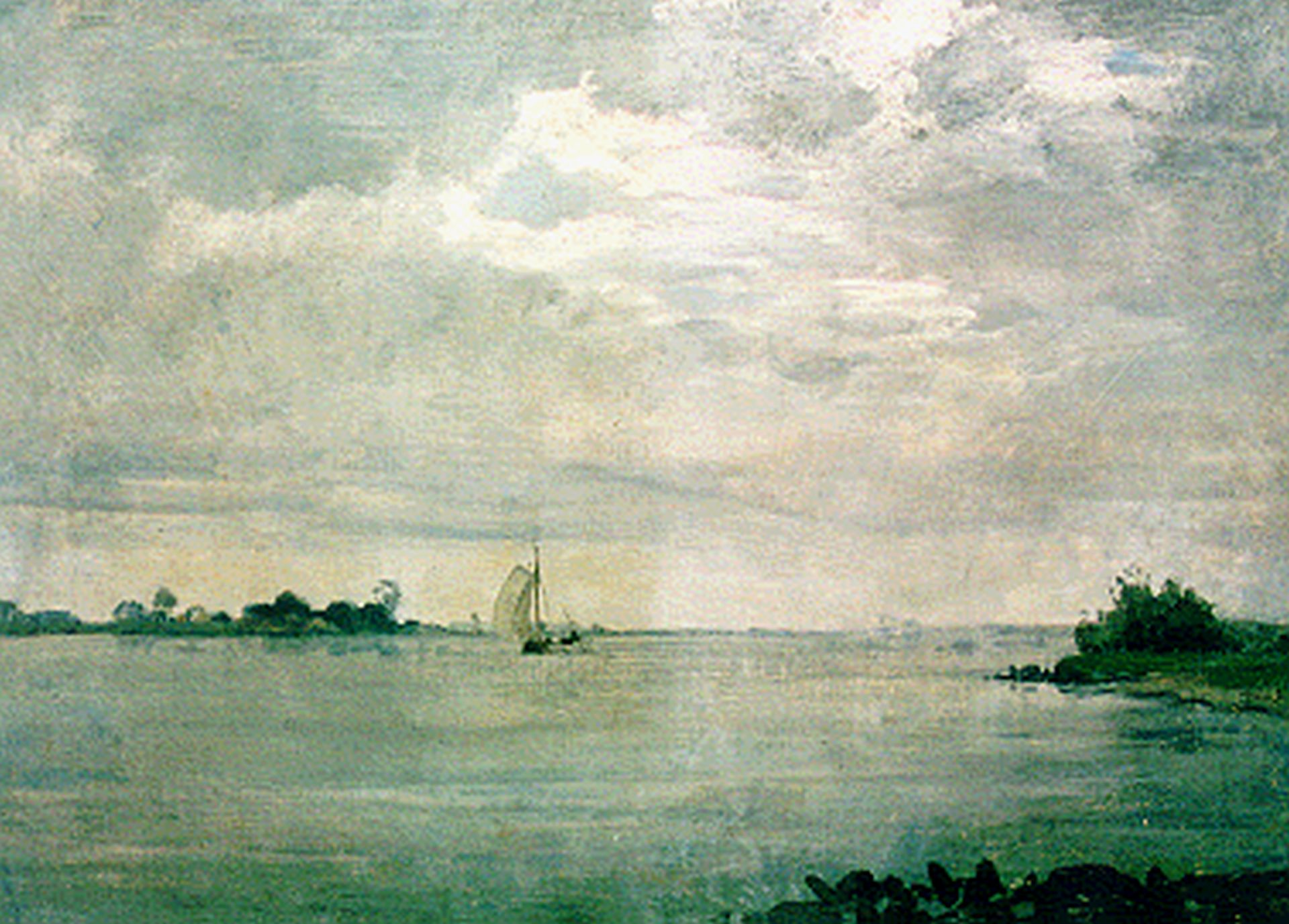 Jan Voerman sr. kunstwerk • schilderij • voorheen te koop Plasgezicht met zeilboot