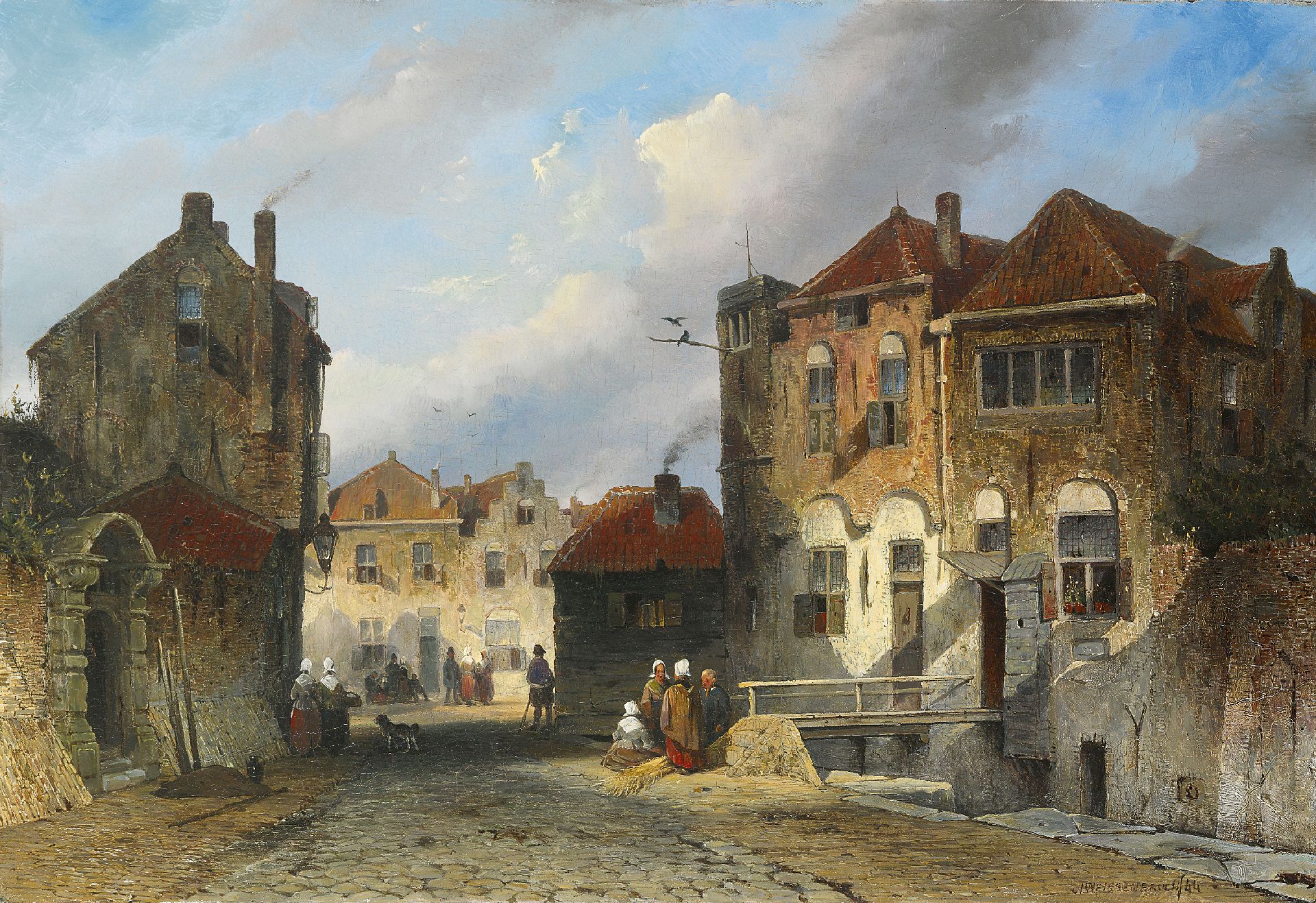 Jan Weissenbruch kunstwerk • schilderij • voorheen te koop Bedrijvigheid in een zonnig Hollands straatje