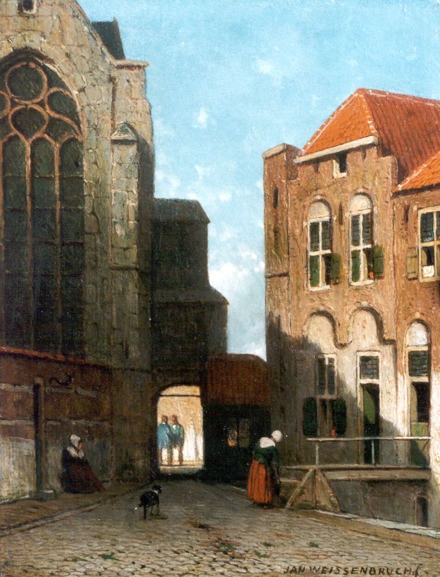 Jan Weissenbruch was in de jaren 50 en 60 van de 19e eeuw een van de belangrijkste exponenten van het realisme in de Nederlandse schilderkunst. Hij kreeg les aan de Haagse Tekenacademie en specialiseerde zich daarna in het schilderen van straatbeelden in onze oude steden en stadjes aan de grote rivieren. Zijn werk staat in de romantische traditie, maar de schilder maakte zich hiervan geleidelijk aan los voor een meer impressionistische benadering. Hij heeft oog voor licht en atmosfeer, wat de schilders van de Haagse School later verder zouden uitwerkten.