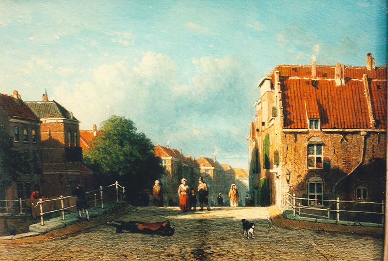 Jan Weissenbruch was in de jaren 50 en 60 van de 19e eeuw een van de belangrijkste exponenten van het realisme in de Nederlandse schilderkunst. Hij kreeg les aan de Haagse Tekenacademie en specialiseerde zich daarna in het schilderen van straatbeelden in onze oude steden en stadjes aan de grote rivieren. Zijn werk staat in de romantische traditie, maar de schilder maakte zich hiervan geleidelijk aan los voor een meer impressionistische benadering. Hij heeft oog voor licht en atmosfeer, wat de schilders van de Haagse School later verder zouden uitwerkten.