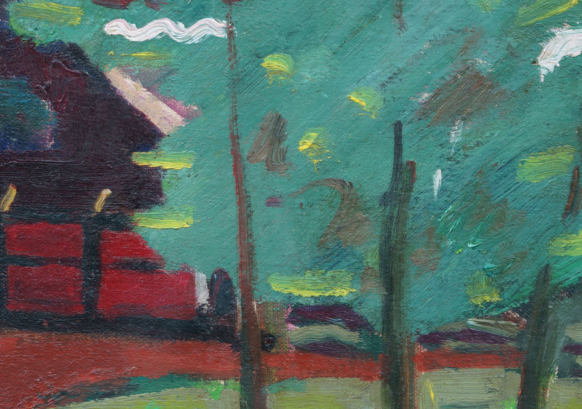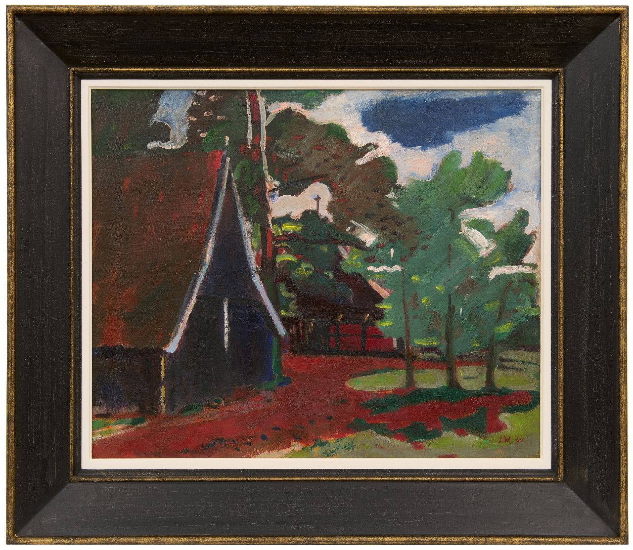 In een krachtig kleurenpalet geeft Jan Wiegers in 1940 zijn expressionistische kijk weer op het Noord-Nederlandse landschap met deze Twentse 'los hoes' boerderij. Wiegers geeft het gebouw schematisch weer. Kleuren worden uit hun ‘normale proporties’ gehaald en details als dakpannen en een houten betimmering van de boerderij zijn vaag te zien. Toch komt de schilder met zijn weergave van de werkelijkheid weg. Niemand zal zich hier aan storen. Het is alsof kijken naar een ‘alledaagse’ boerderij iets feestelijks krijgt en bovendien maakt het je nieuwsgiering naar de reden waarom de schilder op juist deze manier zijn expressie uitte. .