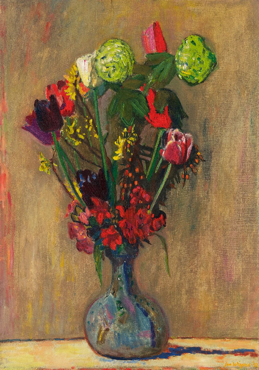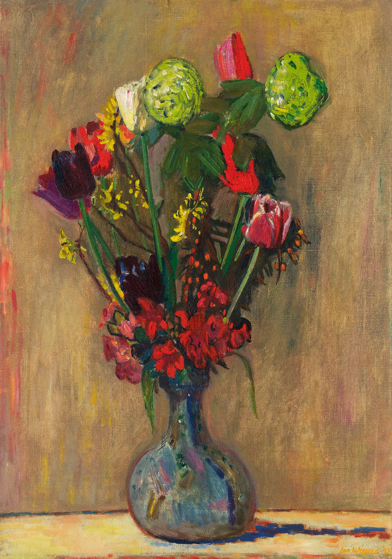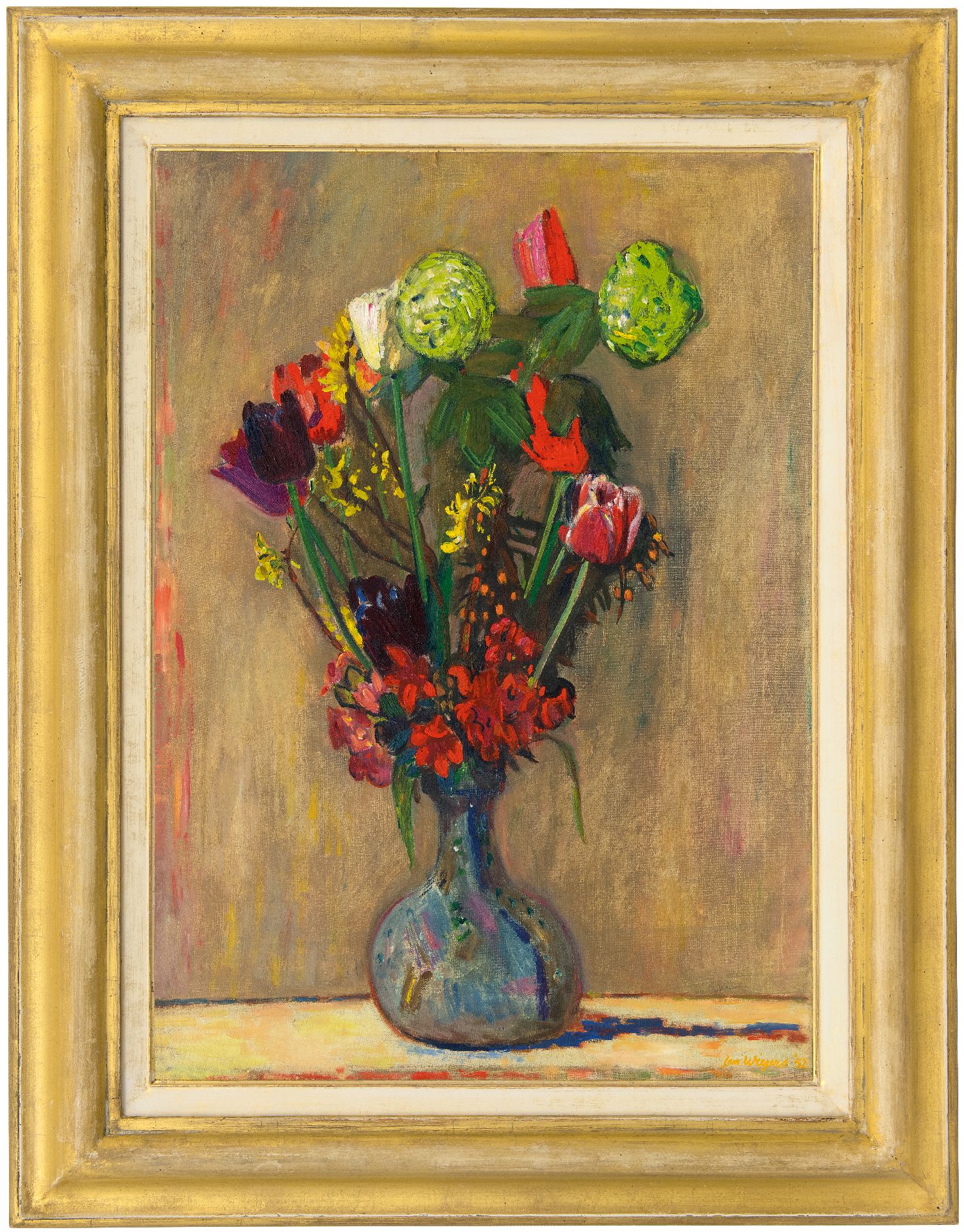 Jan Wiegers kunstwerk • schilderij • voorheen te koop Voorjaarsboeket met tulpen en brem