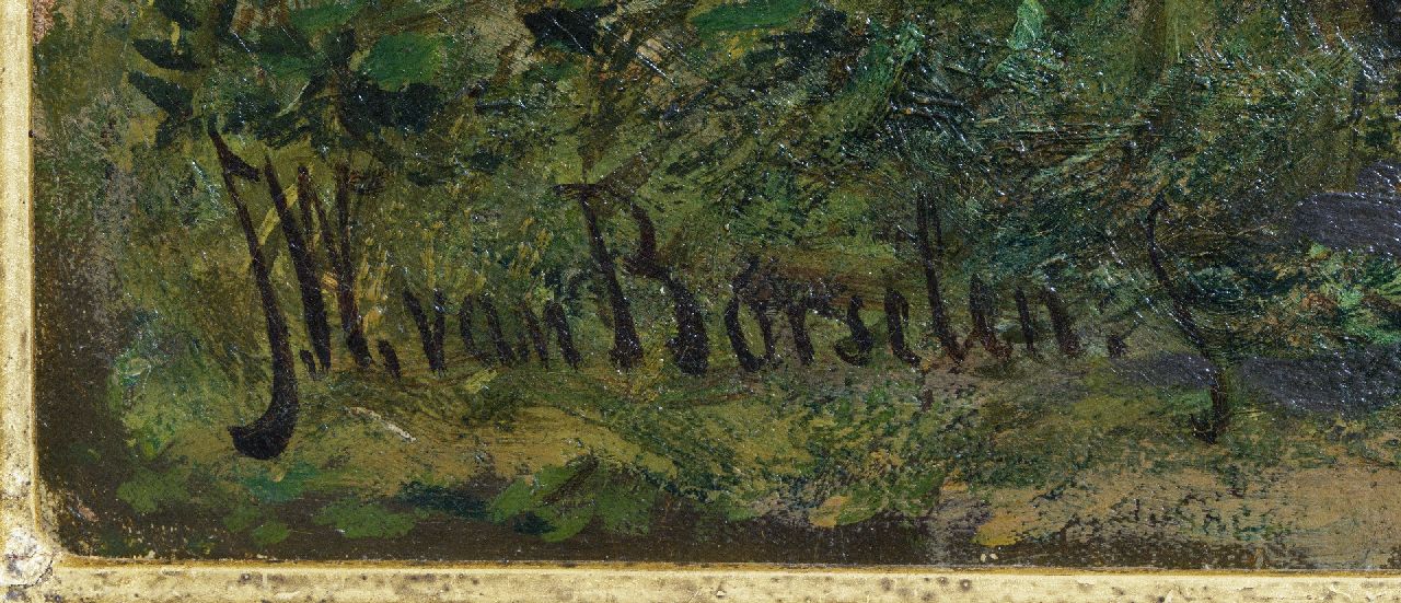 Jan Willem van Borselen kwam in de leer bij Schelfhout toen deze al de respectabele leeftijd had van 68 jaar. Hij werd geboren in het Zuid Hollandse Gouda en was leerling van zijn vader Pieter van Borselen, schilder van boomrijke landschappen en stadsgezichten. Vanaf 1855 werkte hij op het atelier van Schelfhout, meestal in gezelschap van Jan Bedijs Tom die al een goede reputatie als veeschilder had opgebouwd, maar zich wilde bekwamen in het landschapschilderen. De ideale landschapsbenadering van zijn leermeester neemt Van Borselen echter niet over maar hij ontwikkelt zich onder invloed van het opkomende naturalisme tot een ‘eerlijke vertolker’ van de natuur. Tegelijkertijd hanteert hij een weldoordachte compositie waarin zon- en schaduwpartijen elkaar afwisselen. In de omgeving van zijn geboorteplaats Gouda vindt Van Borselen het hoofdthema van zijn schilderkunst: het van vaarten en plassen doorsneden vlakke land omzoomd door wilgen en populieren, waarvan de takken buigen en zwiepen in een altijd aanwezige wind. Net als Schelfhout ondernam hij lange zwerftochten om de natuur te bestuderen. Behalve het Zuid-Hollandse poldergebied waren ook de Gelderse bossen en heide, het rivierlandschap rond de IJssel, en de omgeving van zijn latere woonplaats Den Haag bron van inspiratie. Tijdens schetstochten maakte hij ook kleine, geschilderde paneeltjes, die als uitgangspunt dienden voor zijn atelierstukken. Dat was nog niet erg gebruikelijk. Er wordt gezegd dat Schelfhout bijvoorbeeld geen verf wilde ‘verknoeien’ door buiten te schilderen.