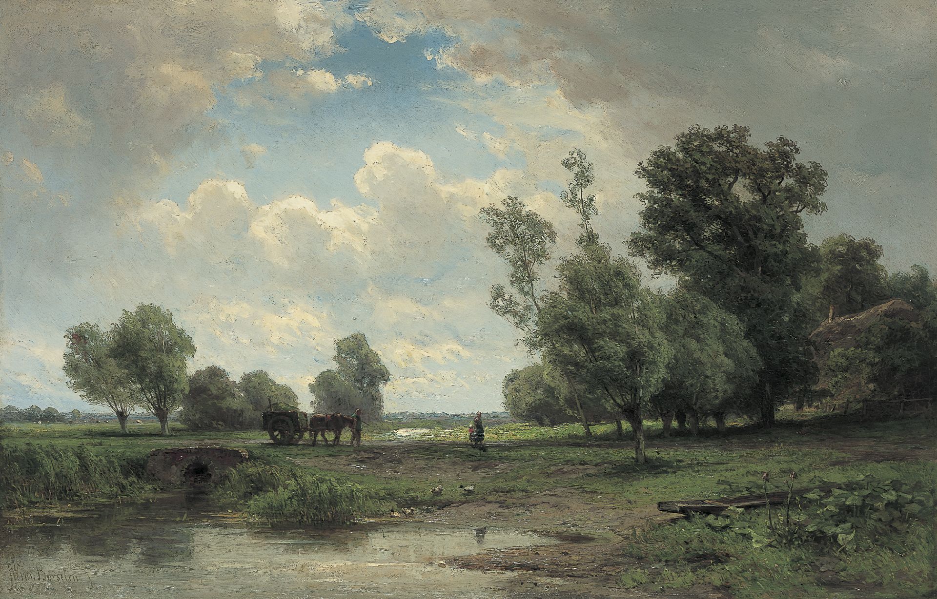 Jan Willem van Borselen kunstwerk • schilderij • voorheen te koop Weidelandschap met boeren en paard en wagen