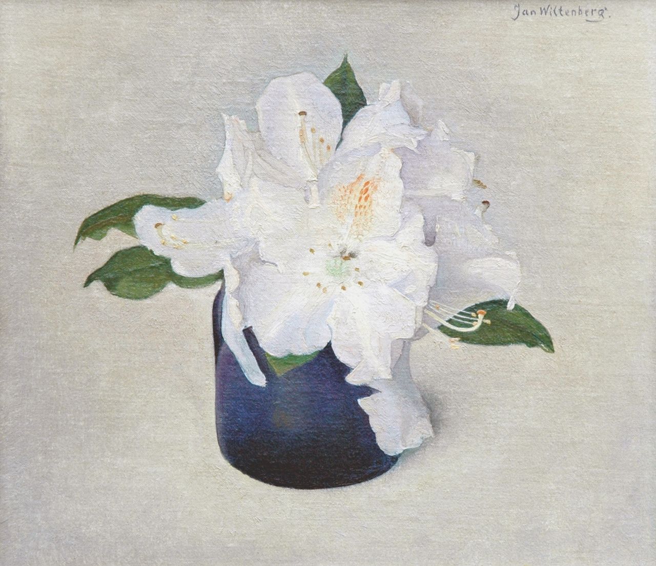 Jan Wittenberg kunstwerk • schilderij • voorheen te koop Stilleven met rododendrons in een blauwe vaas