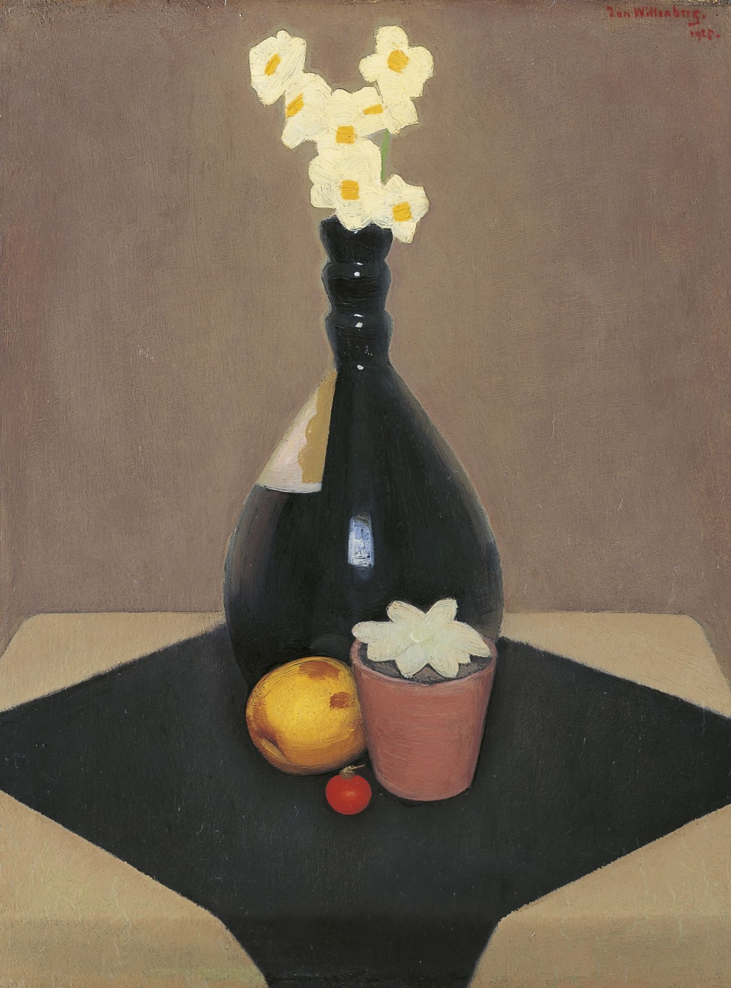 Jan Wittenberg kunstwerk • schilderij • voorheen te koop Stilleven van fles - door Jac. Jongert - met narcissen