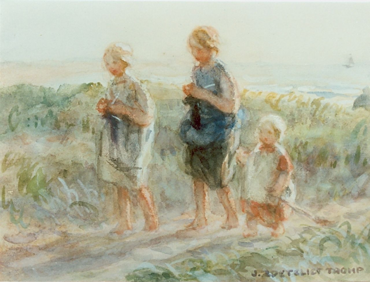 Jan Zoetelief Tromp kunstwerk • aquarel • tekening • voorheen te koop Wandelende meisjes in de duinen