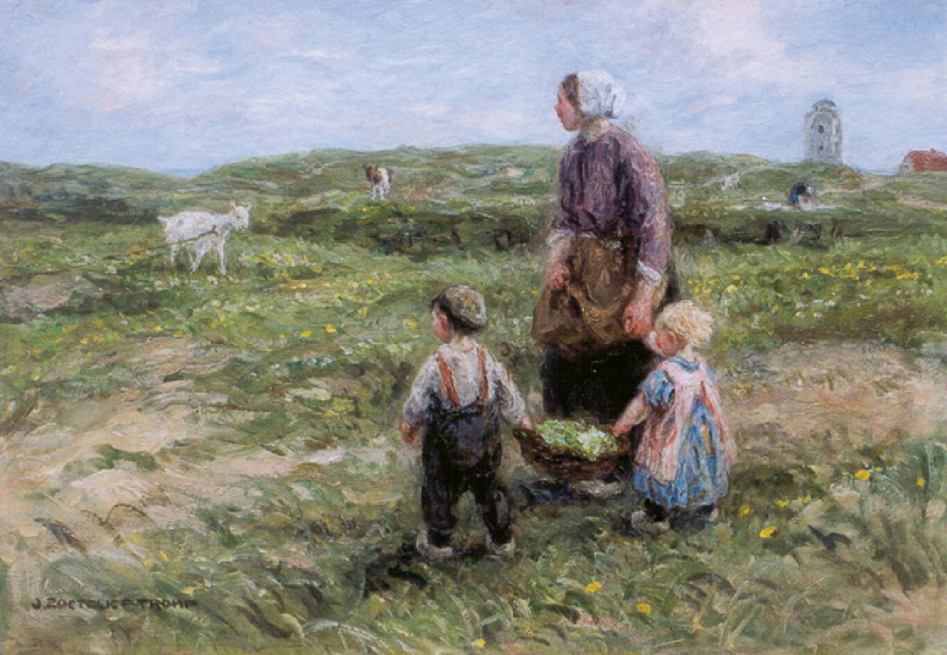 Blaricum en Katwijk waren de twee dorpen waar Jan Zoetelief Tromp het meeste schilderde. In Blaricum vond hij vanaf 1899 het boerenleven, Katwijk 'ontdekte' hij in 1905. Eerst brengt hij er alleen de zomers door met zijn gezin, vanaf 1914 woont hij er permanent. Hij schildert er het leven van de vissersbevolking, maar vooral voorstellingen met kinderen: spelend op het strand, geitjes hoedend of terugkerend uit de duinen. Deze taferelen zijn altijd idyllisch en stralen het familiegeluk uit dat hij vermoedelijk zelf ook kende. Omdat de schilder doof was en enigszins teruggetrokken, nam hij vaak zijn eigen vrouw en kinderen als model.