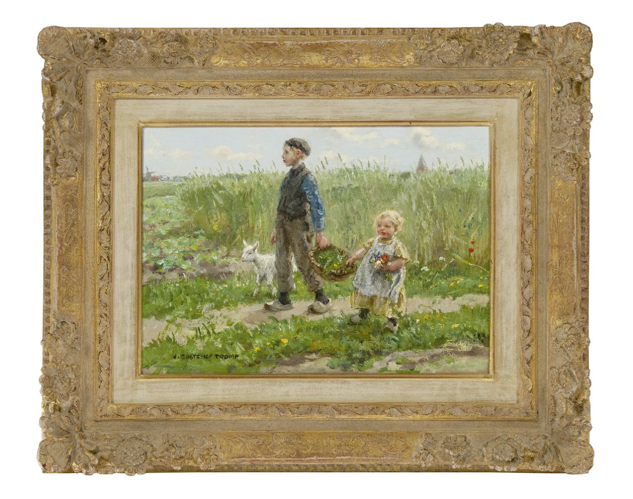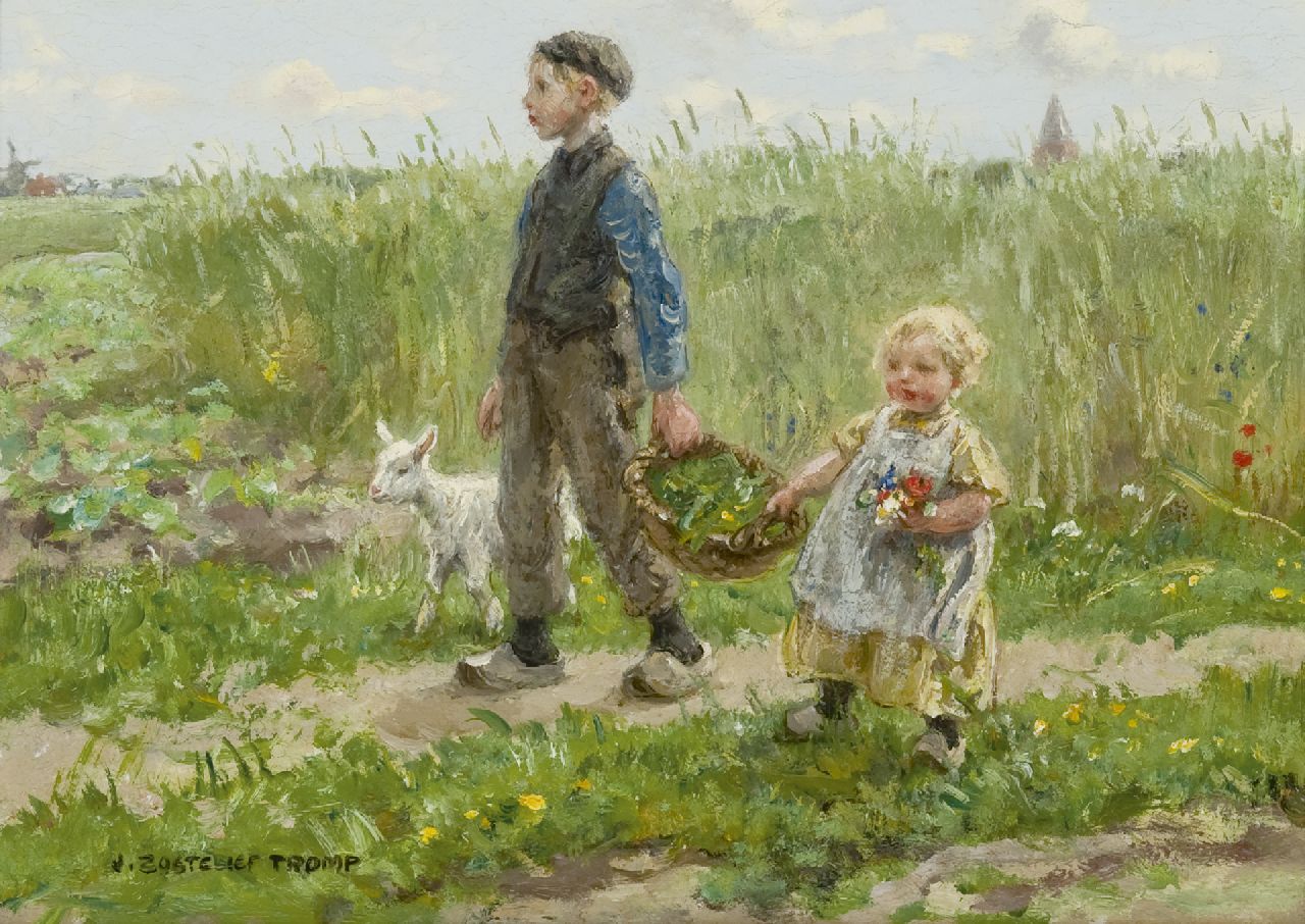 Blaricum en Katwijk waren de twee dorpen waar Jan Zoetelief Tromp het meeste schilderde. In Blaricum vond hij vanaf 1899 het boerenleven, Katwijk 'ontdekte' hij in 1905. Eerst brengt hij er alleen de zomers door met zijn gezin, vanaf 1914 woont hij er permanent. Hij schildert er het leven van de vissersbevolking, maar vooral voorstellingen met kinderen: spelend op het strand, geitjes hoedend of terugkerend uit de duinen. Deze taferelen zijn altijd idyllisch en stralen het familiegeluk uit dat hij vermoedelijk zelf ook kende. Omdat de schilder doof was en enigszins teruggetrokken, nam hij vaak zijn eigen vrouw en kinderen als model.
