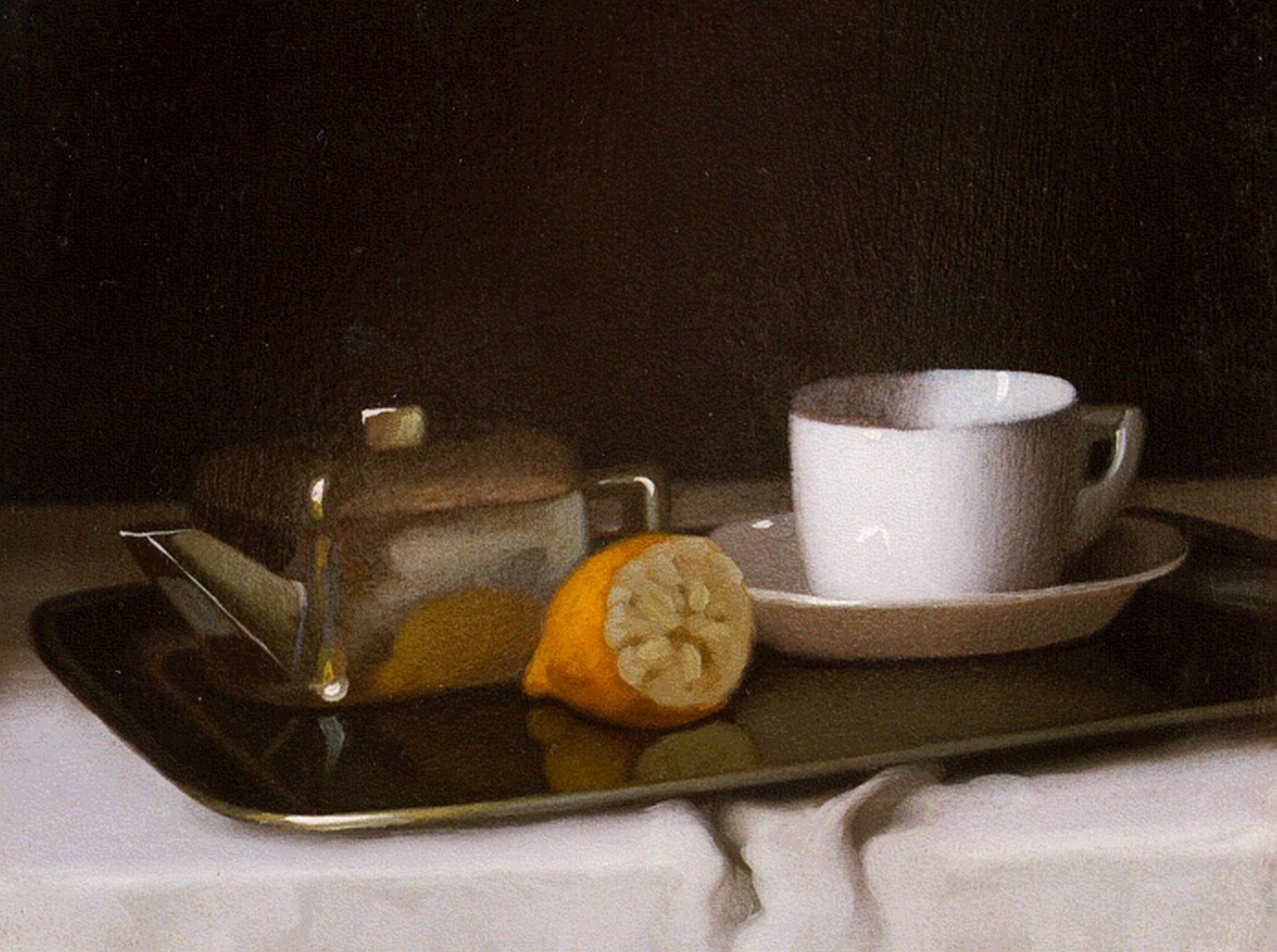 Janos Pentelei Molnar kunstwerk • schilderij • voorheen te koop Stilleven met theeservies en citroen