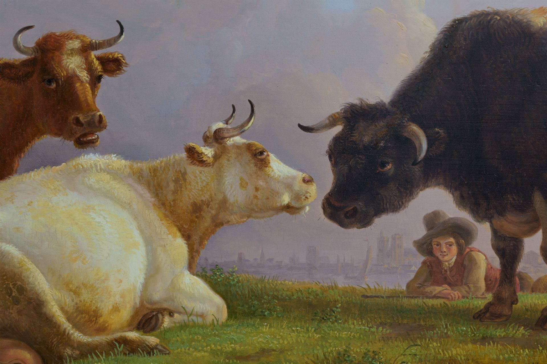 Herdersjongen met koeien en stier, een stad in de verte