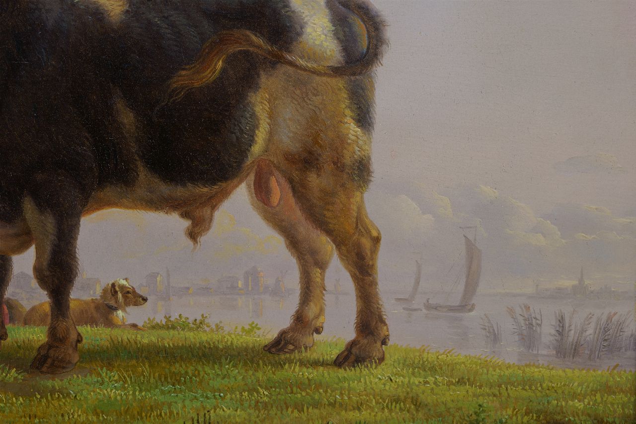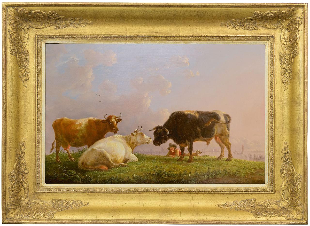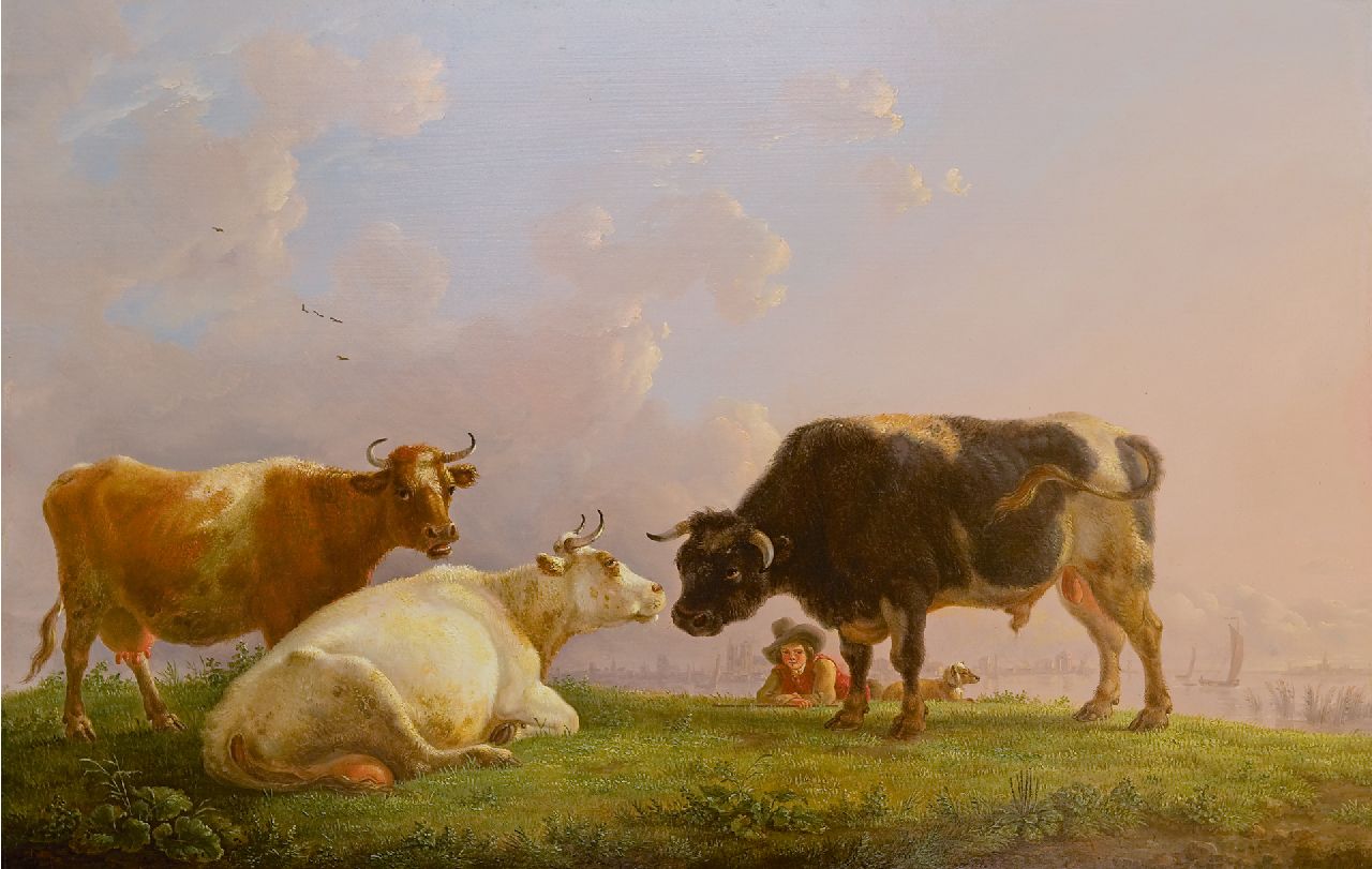 Jean Baptiste De Roy kunstwerk • schilderij • te koop Herdersjongen met koeien en stier, een stad in de verte