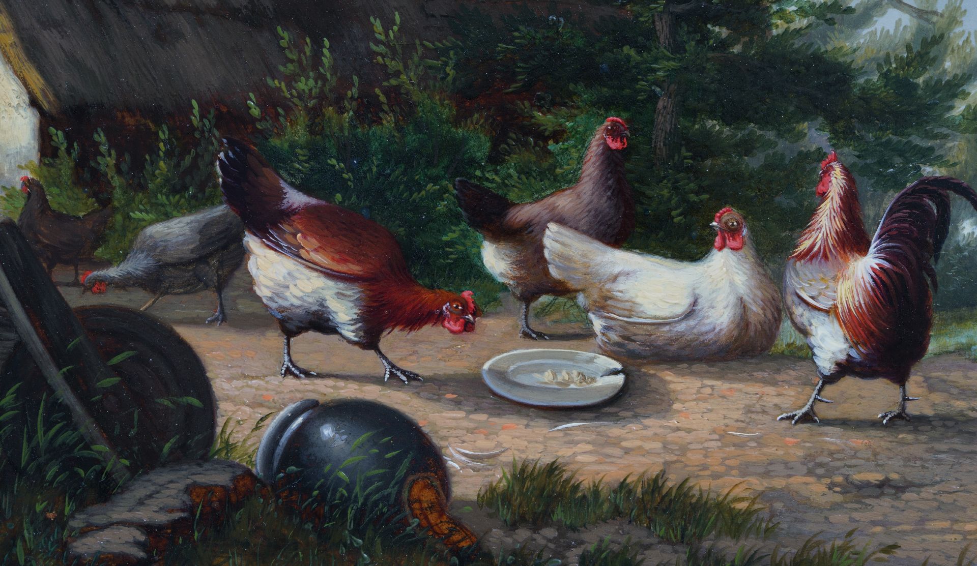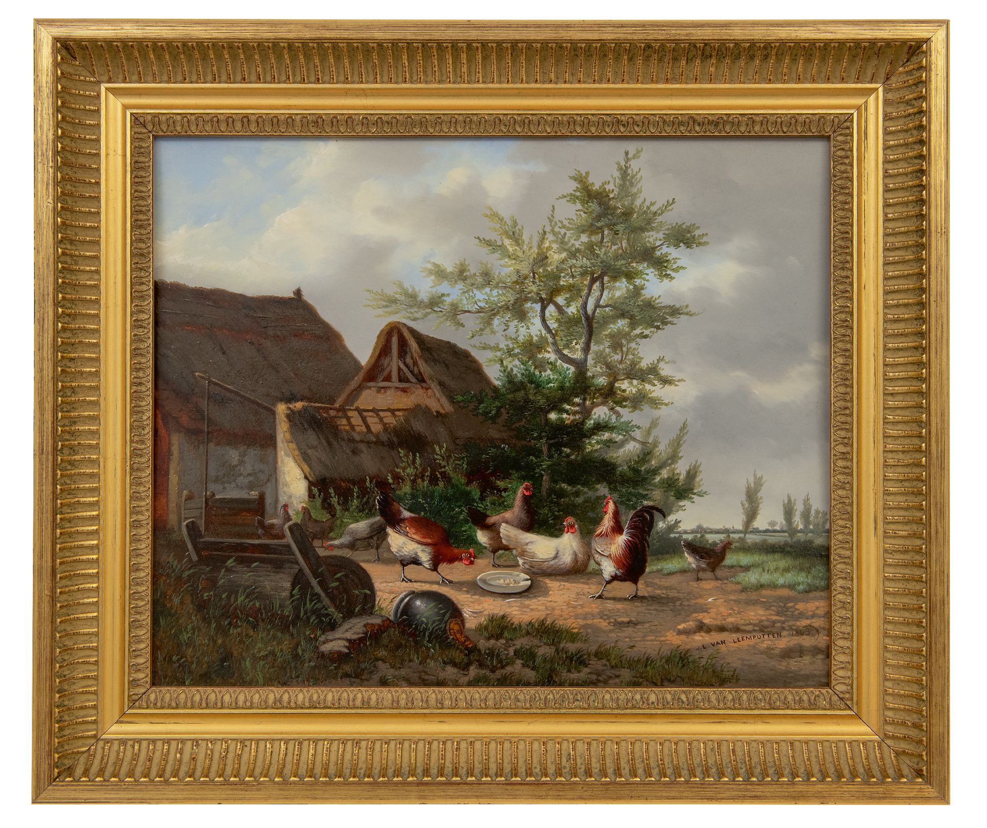 Jean-Baptiste Leopold van Leemputten kunstwerk • schilderij • te koop Boerenerf met haan en kippen