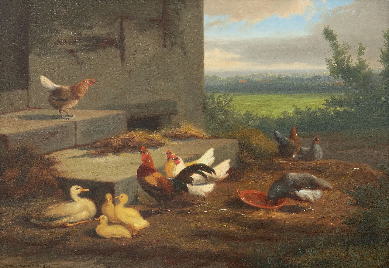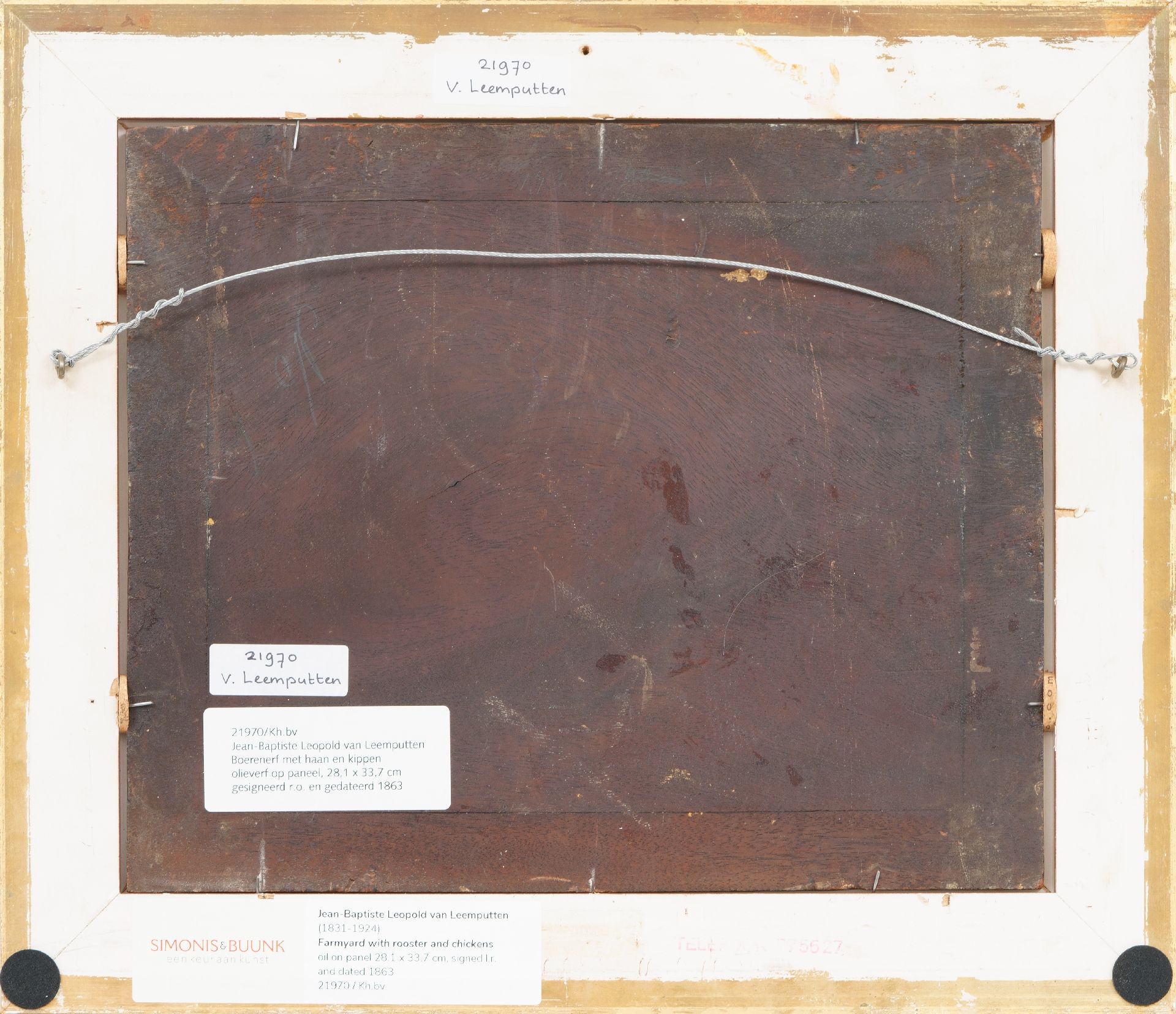 Jean-Baptiste Leopold van Leemputten | Kippen en eenden op een boerenerf, olieverf op paneel, 24,0 x 36,2 cm, gesigneerd l.o. en gedateerd 1869