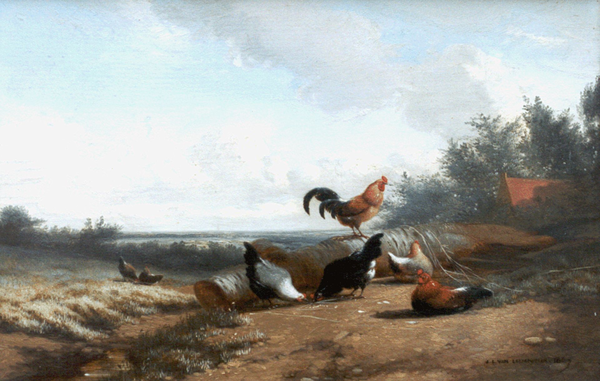 Jean-Baptiste Leopold van Leemputten kunstwerk • schilderij • voorheen te koop Haan en kippen in een landschap