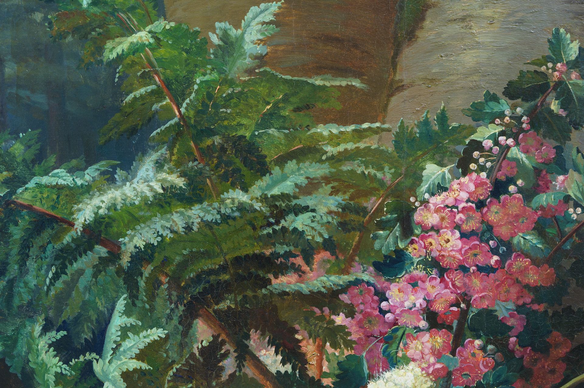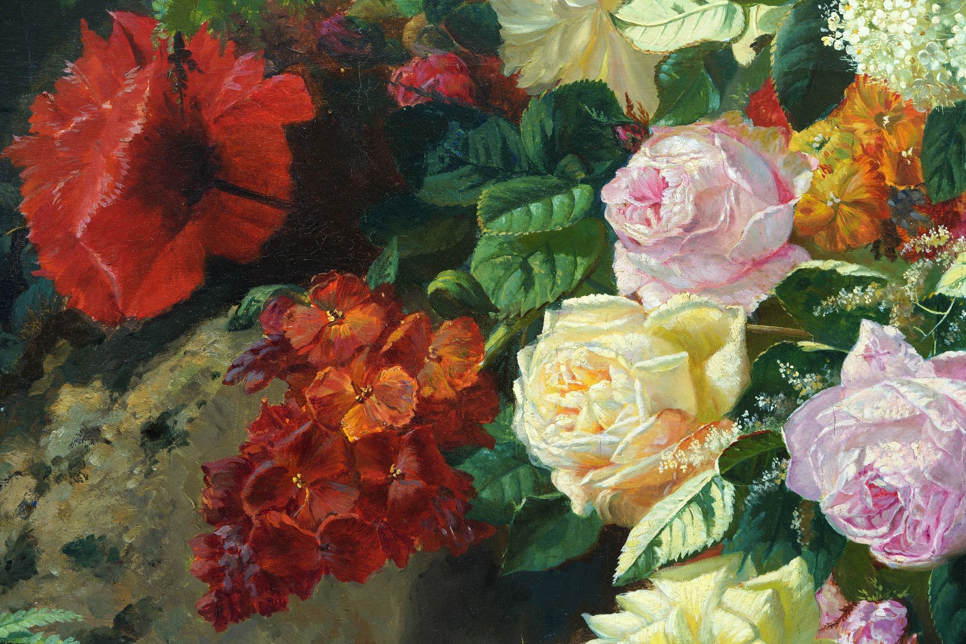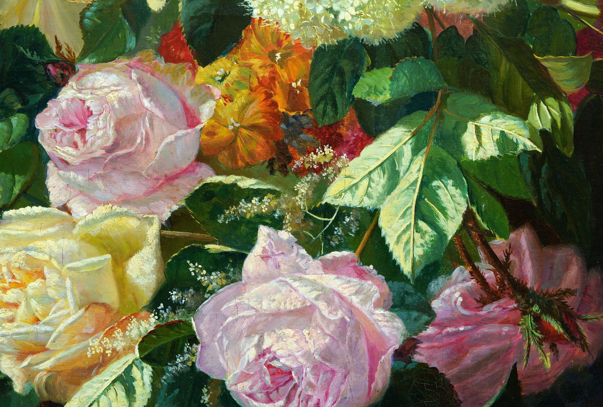 Deze weelderige waterval van rozen en bloeiende takken, losjes neergelegd op een steen bij het water, werd geschilderd door Jean Baptiste Robie. Romantische bloemstillevens bezorgden deze Belgische kunstenaar zijn roem, hoewel hij ook landschappen, portretten en oriëntaalse taferelen maakte. Het oeuvre van Robie lijkt een hommage aan de roos, die in zijn boeketten vaak een hoofdrol speelt. Het ging Robie om het decoratieve en natuurlijke aspect van de roos, waarmee hij aansloot bij een in de 19e eeuw veranderende benadering van het bloemstilleven. Zijn stillevens zijn schijnbaar achteloos neergelegd in een natuurlijk omgeving. Daarmee brak hij met de traditie van het 18e-eeuwse, zorgvuldig geschikte pronkstilleven met bloemen. Het klassieke bloemstilleven werd gevormd door een vaas met een boeket, waarvan de soms curieuze samenstelling voornamelijk werd bepaald door botanische bijzonderheid, exotische herkomst, esthetiek, symboliek én de goede zichtbaarheid van elke afzonderlijke bloem. In de 19e eeuw worden het boeket en de omgeving natuurlijker: de schikking wordt losser, gewone, dagelijkse bloemen doen hun intrede en vaak is er sprake van een landschappelijk decor. Zijn composities blinken uit door hun prachtige stofuitdrukking en rijke coloriet.
