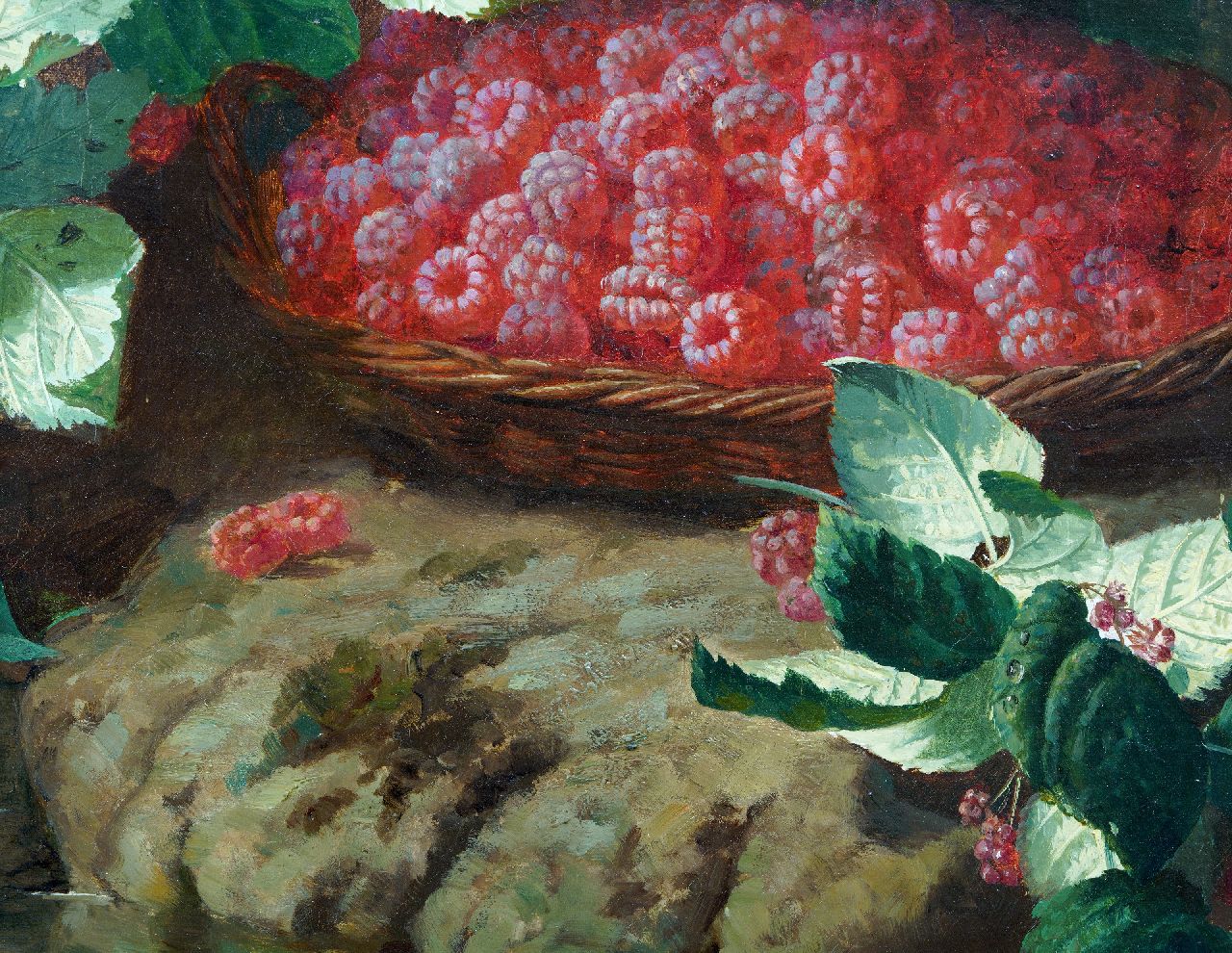Jean-Baptiste Robie kunstwerk • schilderij • te koop Bloemstilleven met rozen, bloeiende takken en frambozen