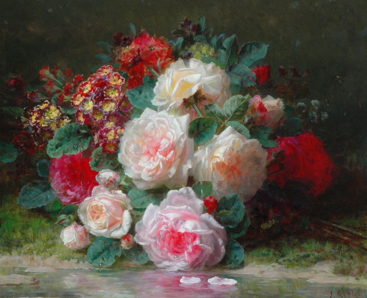 Jean-Baptiste Robie kunstwerk • schilderij • voorheen te koop Bloemstilleven met rozen en primula's