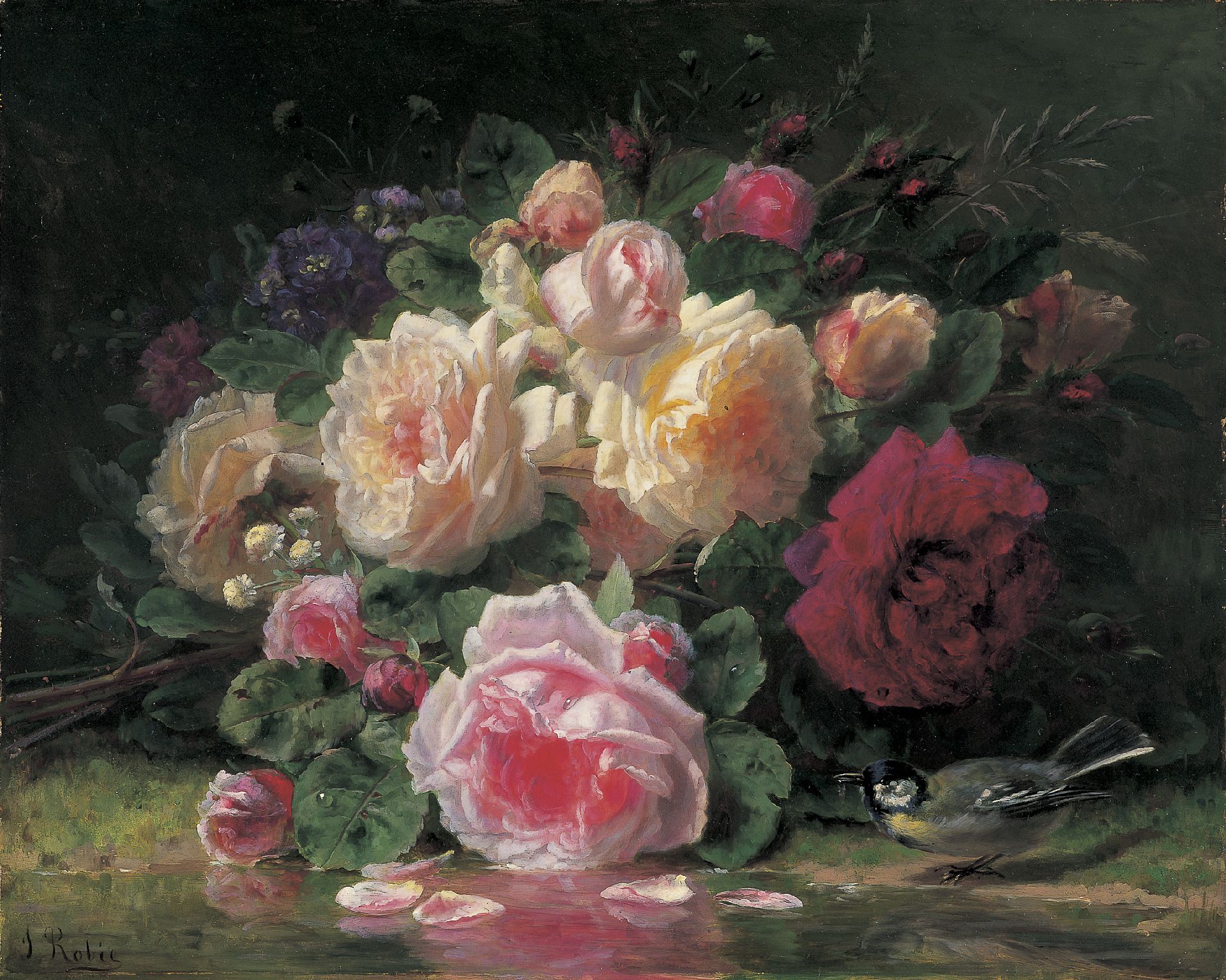Jean-Baptiste Robie kunstwerk • schilderij • voorheen te koop Rozen en koolmees aan de vijverrand