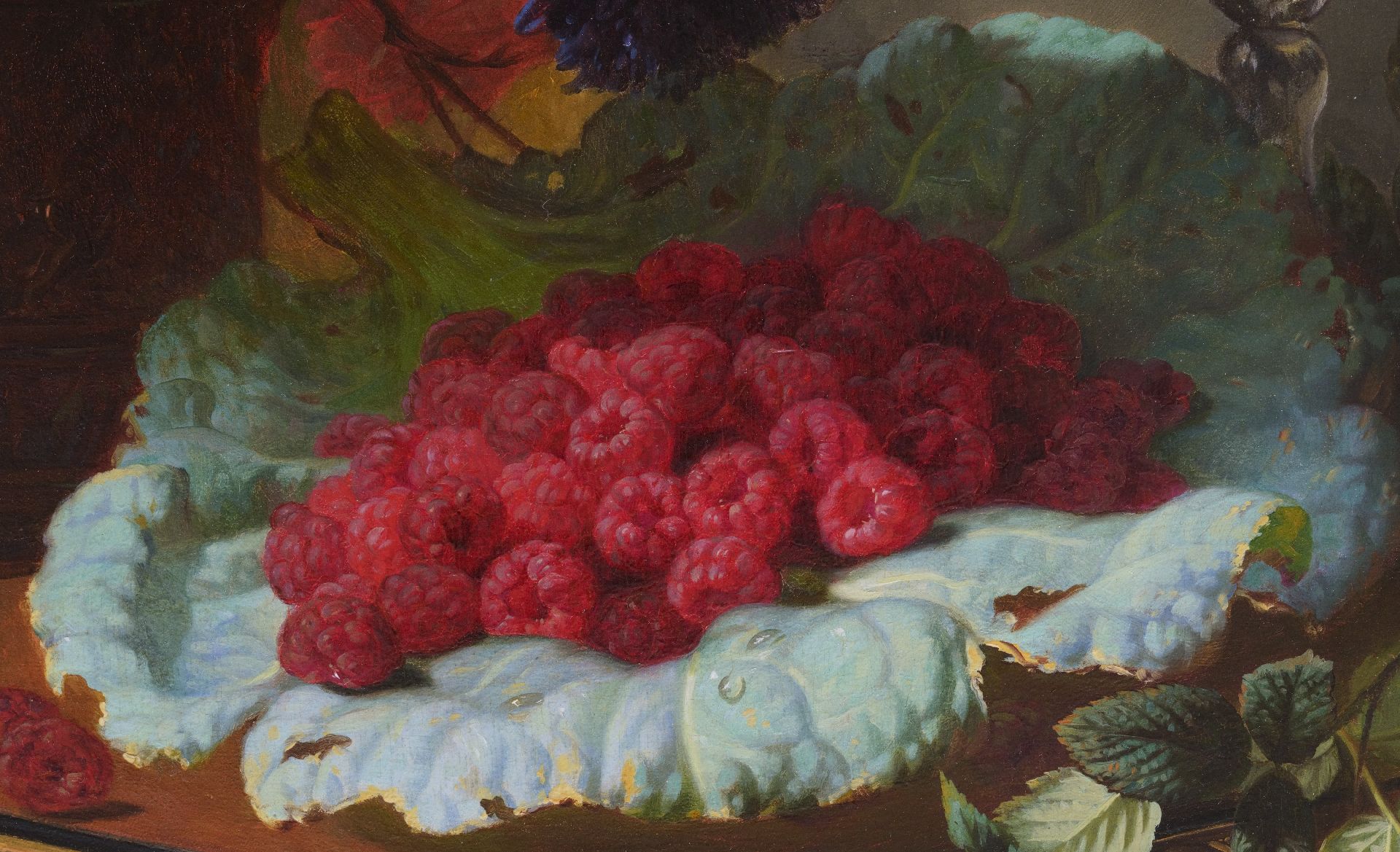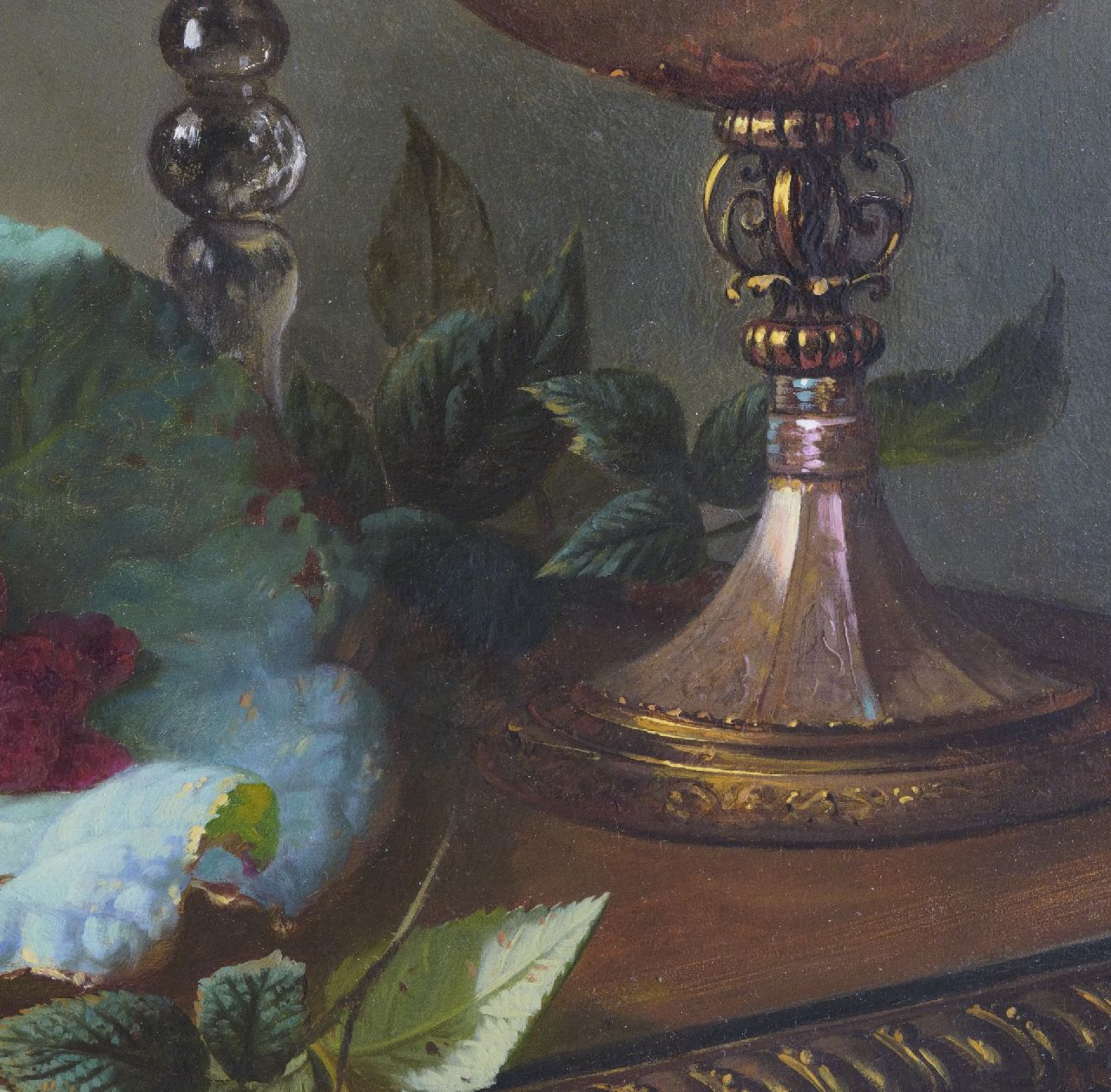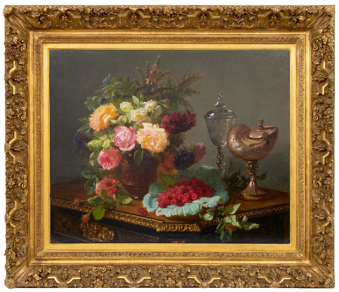 Jean-Baptiste Robie kunstwerk • schilderij • voorheen te koop Stilleven met rozen, vruchten en een nautilusbeker