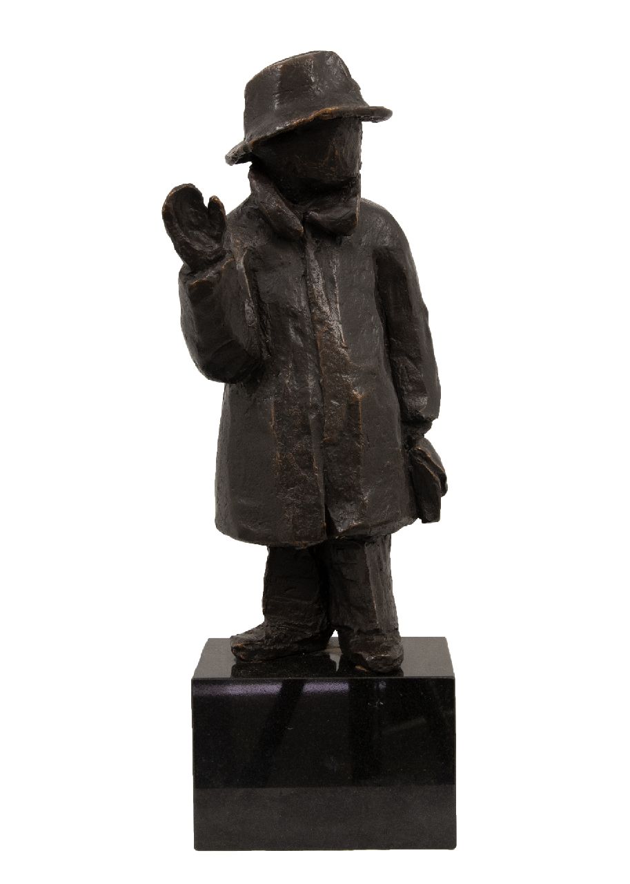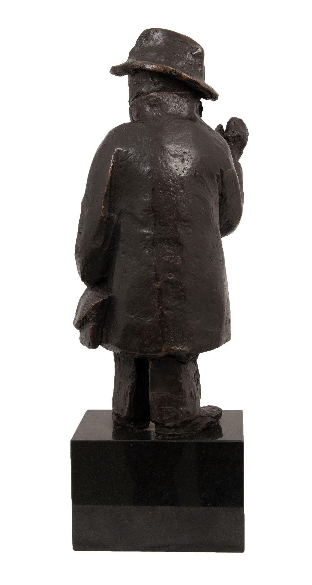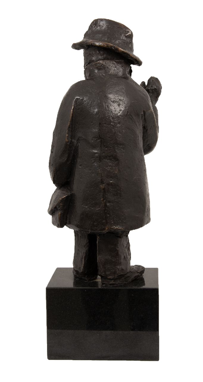Jeannette van den Ingh kunstwerk • beeld • sculptuur • te koop Man met mantel, hoed en tas