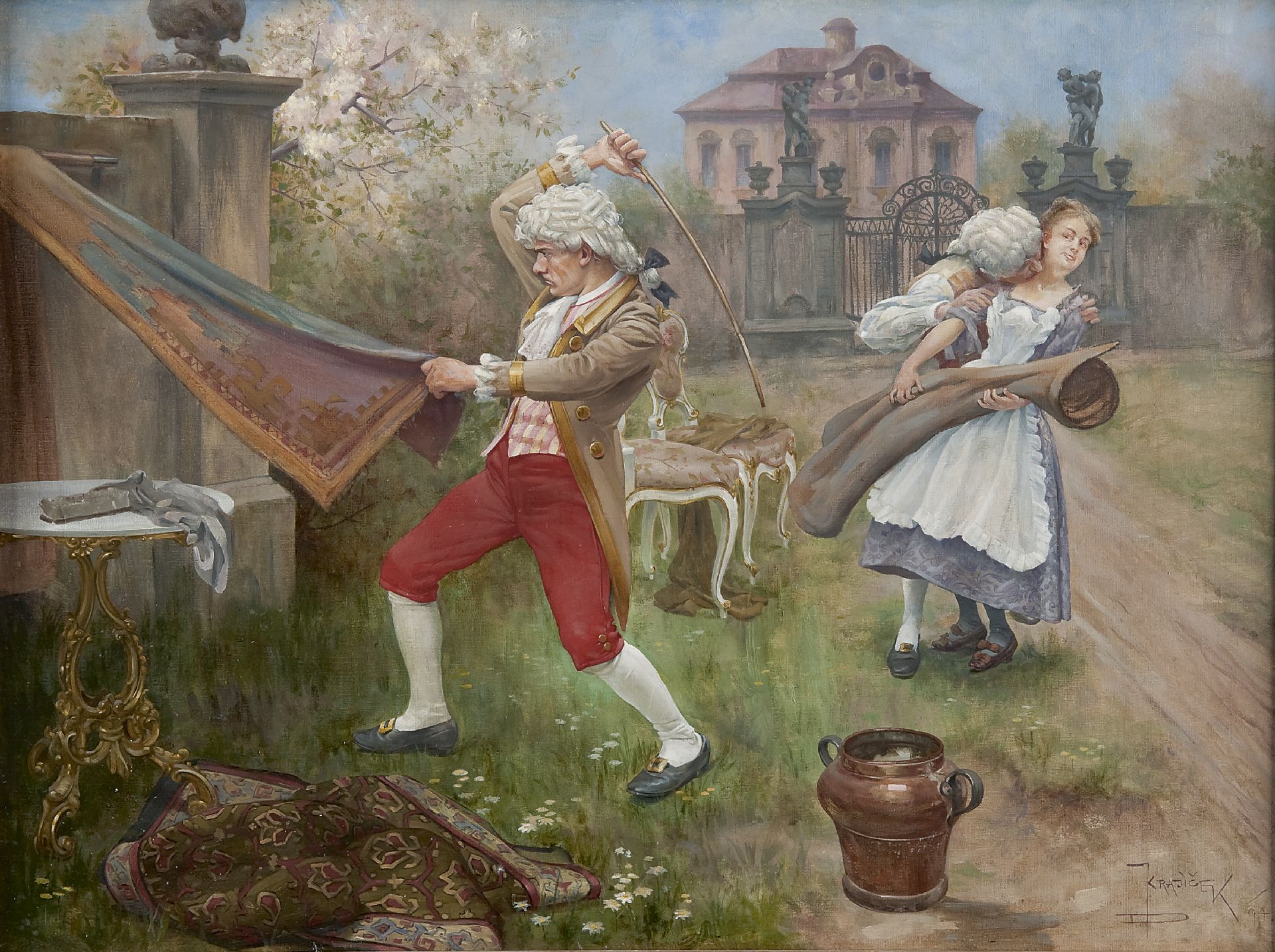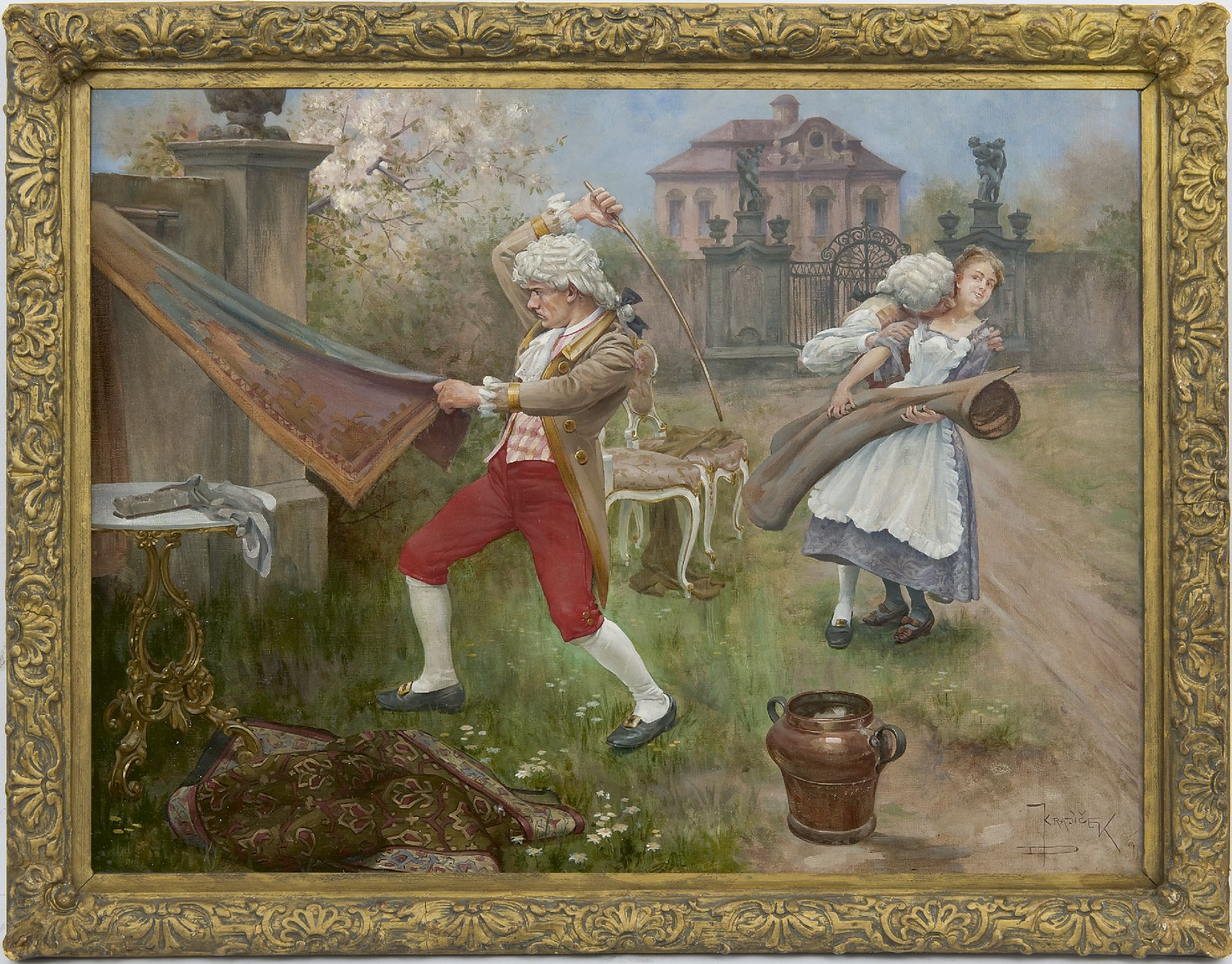 Een opmerkelijk 19e-eeuws tafereel met een hedendaags tintje. Een lakei is druk doende om met een roede kleden te kloppen; met bedreven hand slaat hij het oude stof uit de karpetten. Een tweede livreiknecht heeft ondertussen meer oog voor het dienstmeisje dan voor het werk dat gedaan moet worden. Deze licht pikante scène zal in zijn tijd wellicht ook op een andere manier stof hebben doen opwaaien… Slaan kan hij, de huisbediende: bijna hartstochtelijk kwijt hij zich van zijn taak. Deze handeling krijgt een extra dimensie door naam van de maker, de Tsjechische kunstenaar Jindřich Duchoslav Krajíček. Hoewel niet bekend is of hij een voorvader is van onze tennisser Richard Krajicek en diens halfzusje Michaela, is duidelijk dat ook deze schilder wist wat een goede slag waard is.