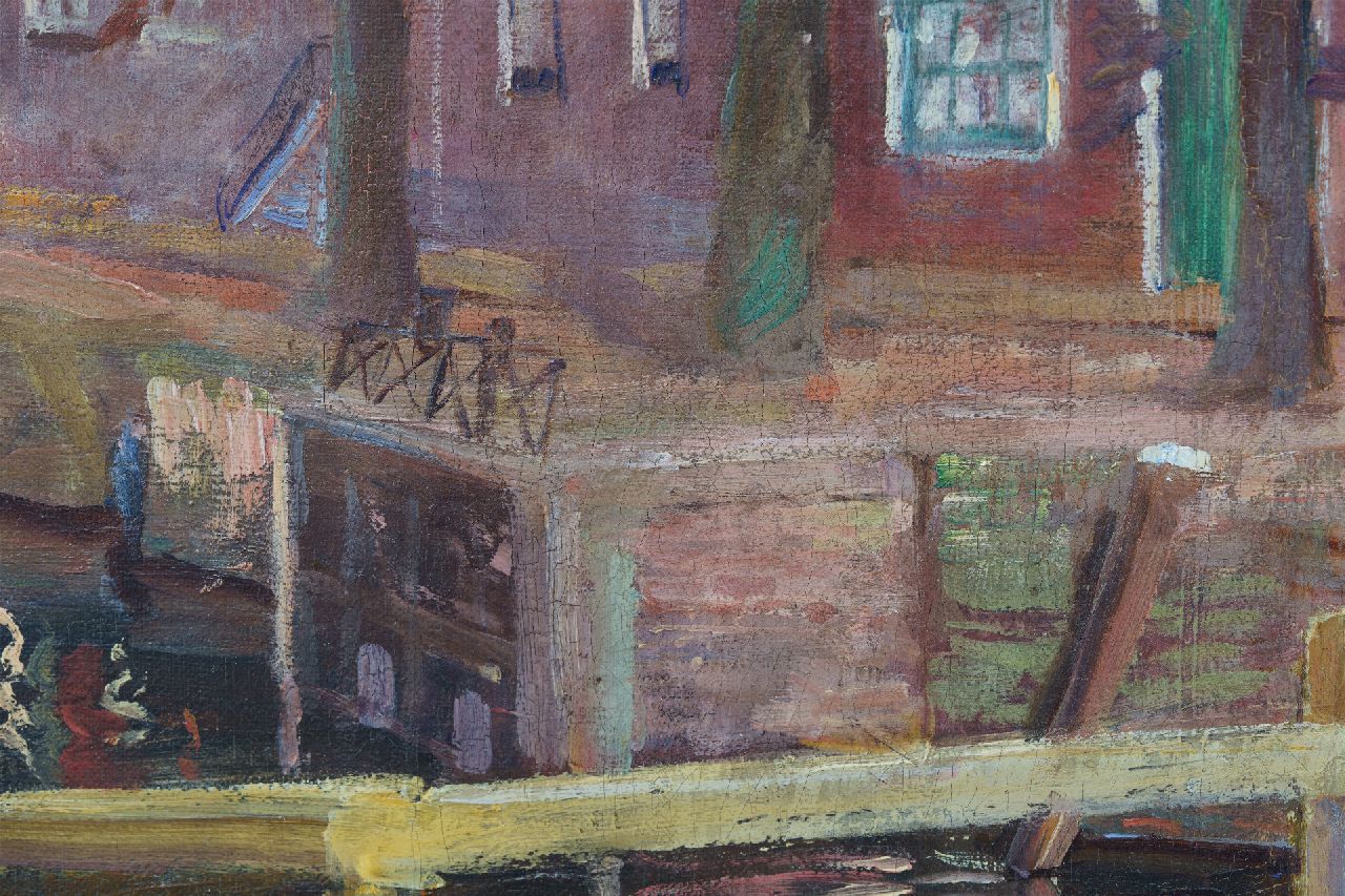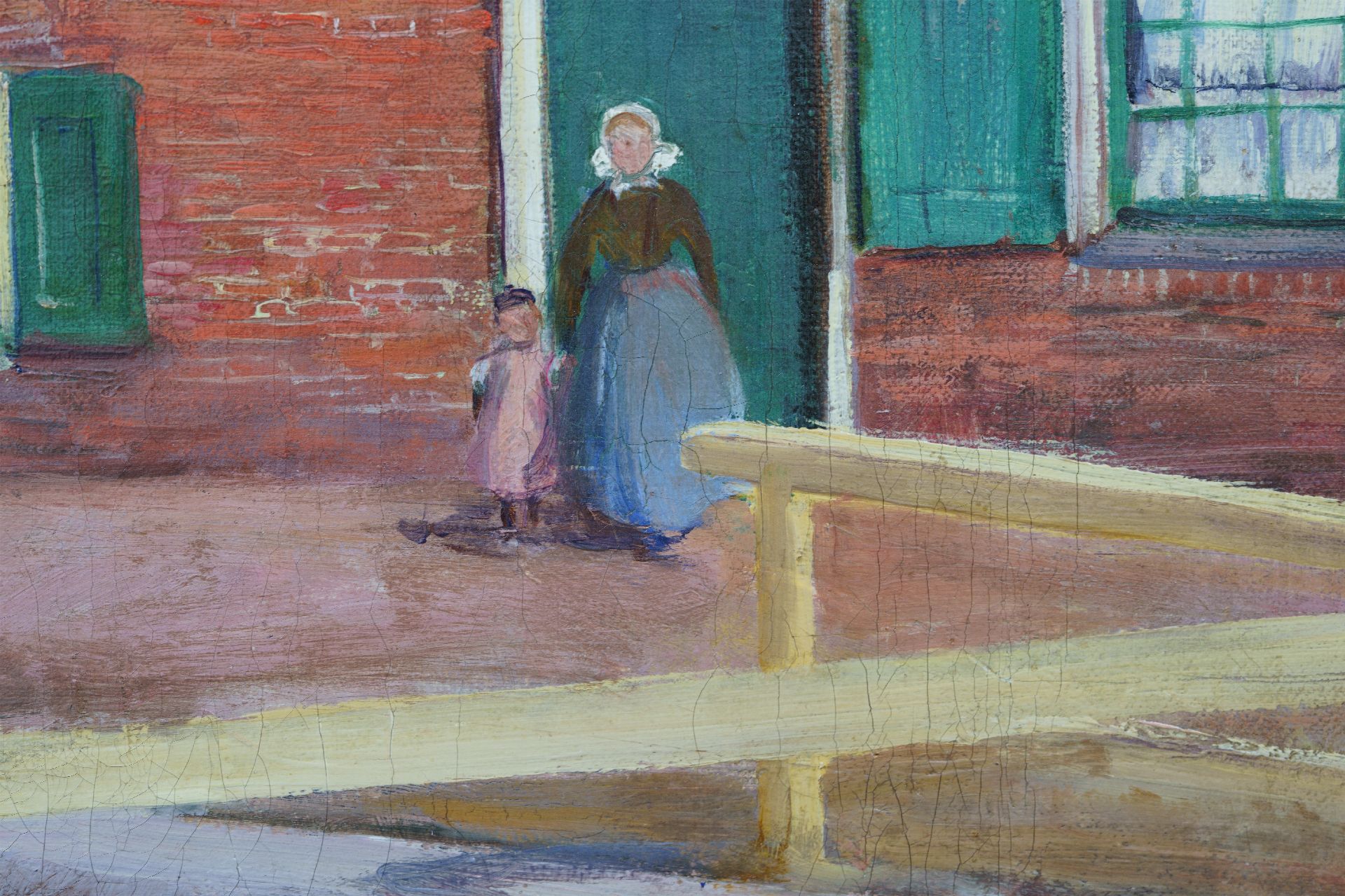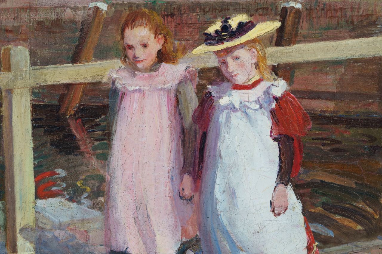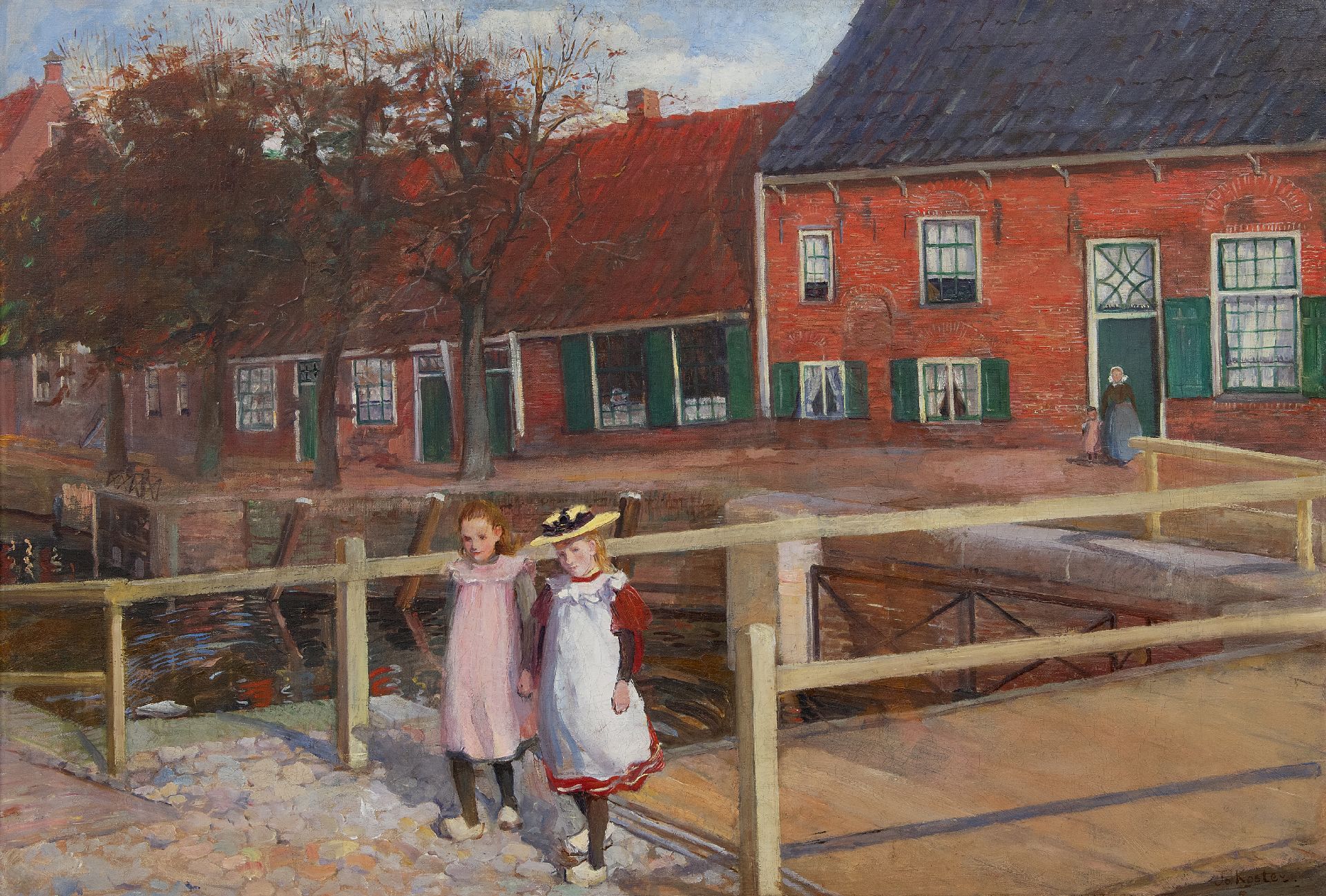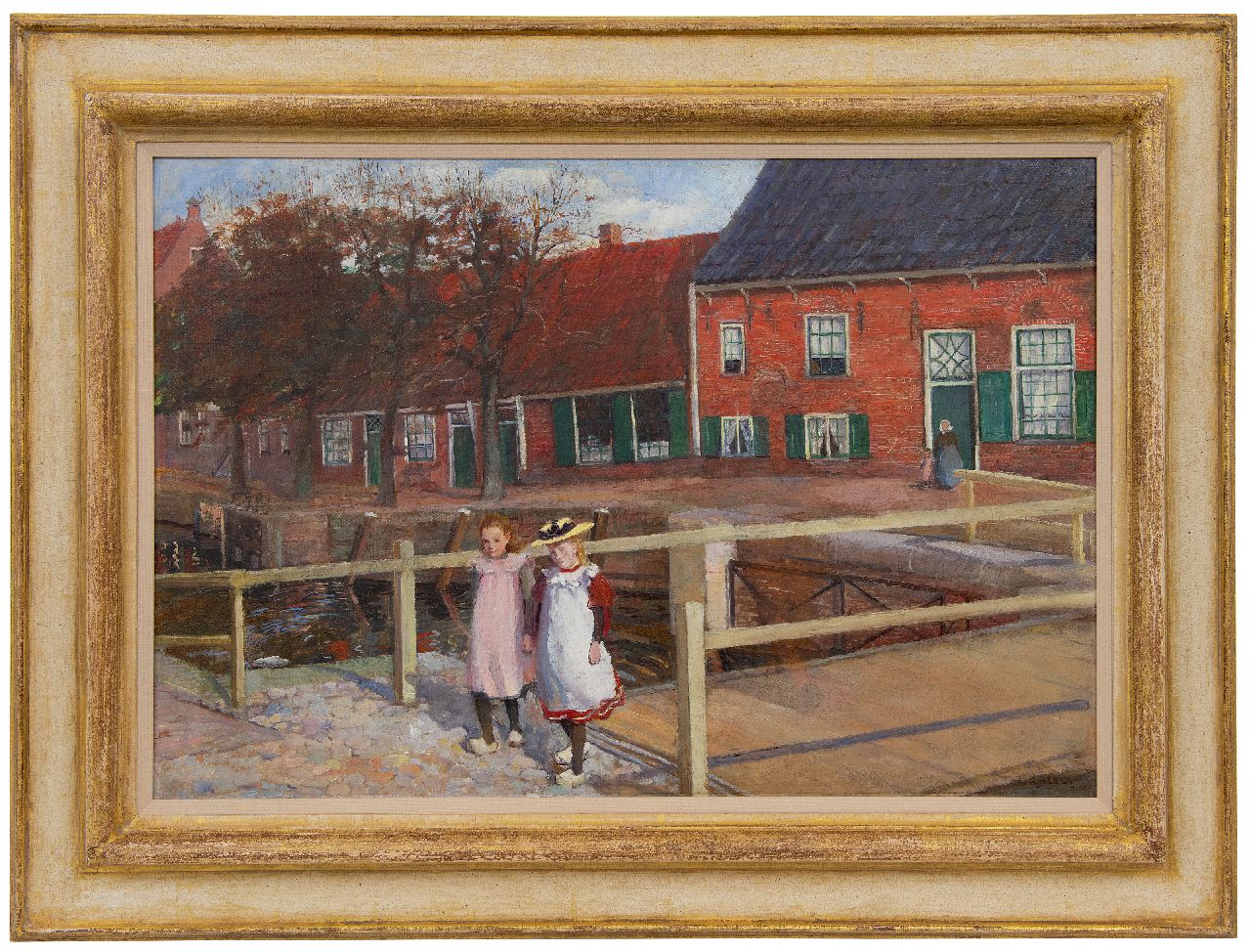 Jo Koster kunstwerk • schilderij • voorheen te koop Twee meisjes bij de stadsgracht in Hasselt